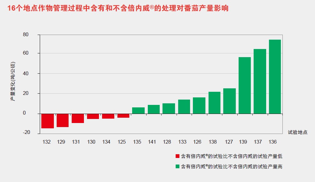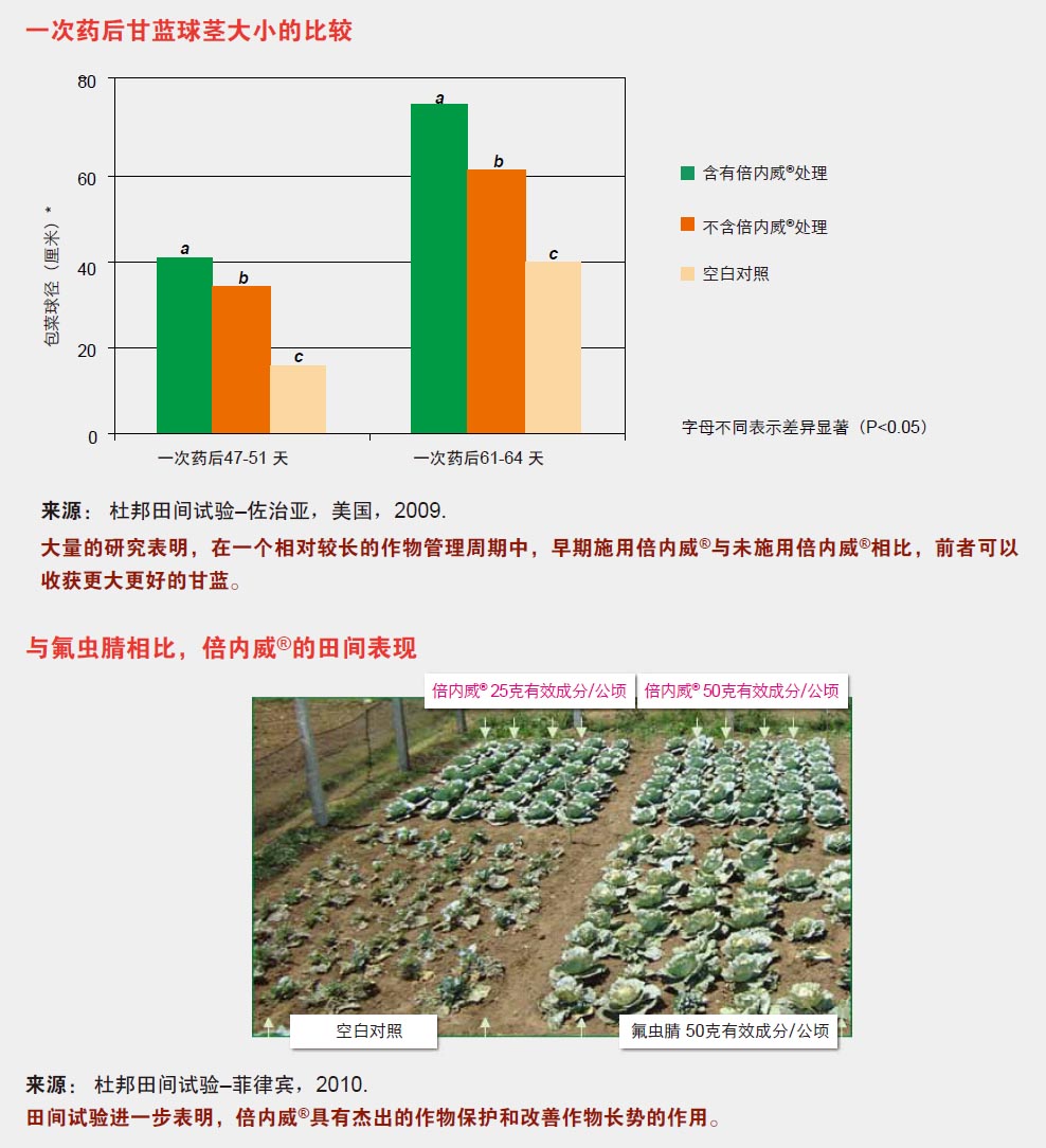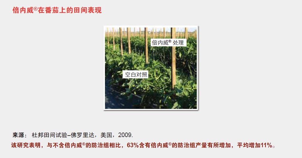 对不同作物的研究表明,在一个长周期的作物管理中,使用杜邦TM倍内威®的处理比未使用杜邦TM倍内威®的处理具有更高的 产量。产量的增加与作物种类、地点、虫害发生情况及环境和农事条件都有关联,截至目前的数据表明,在作物综 合管理系统中使用杜邦TM倍内威®,能够为作物增产提供更多机会,已验证的作物包括包菜、番茄、辣椒、瓜类和水稻。