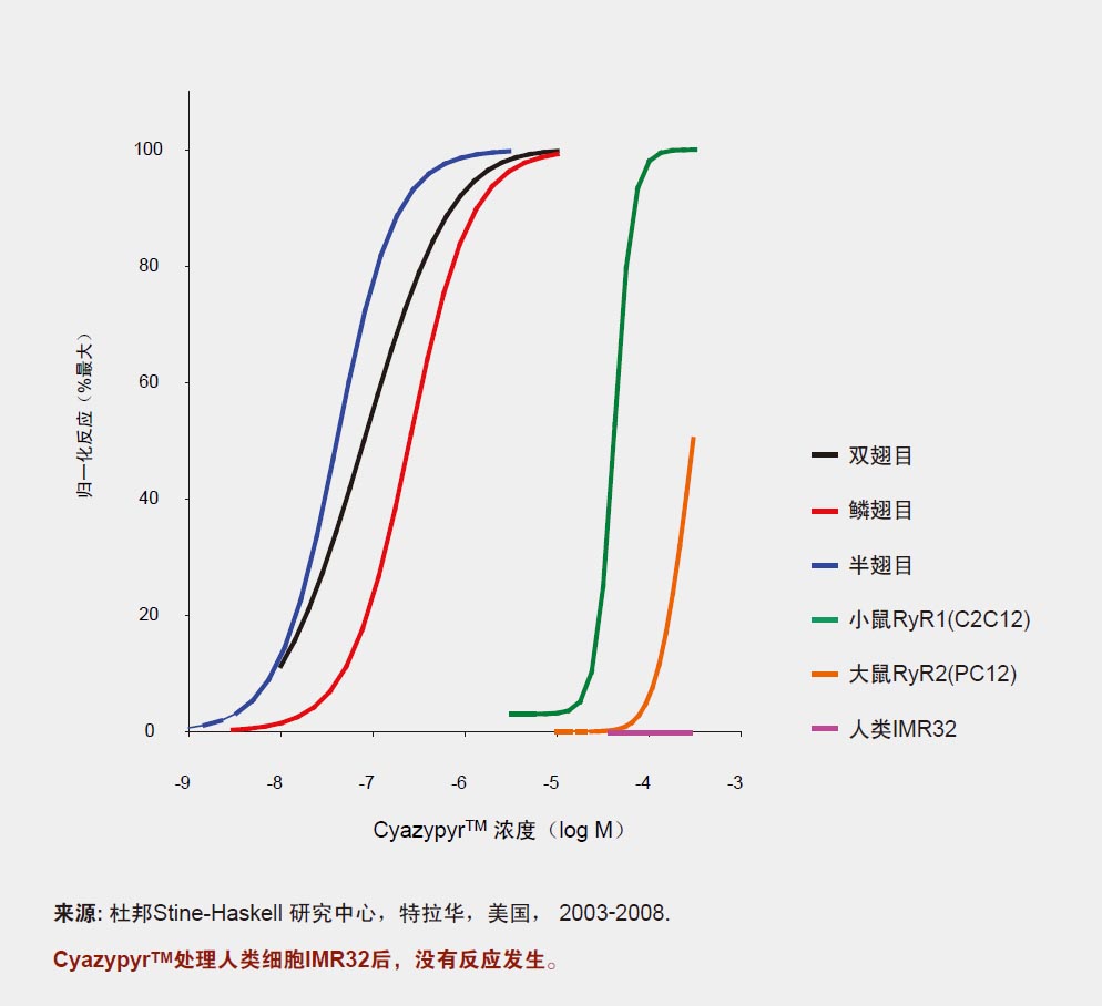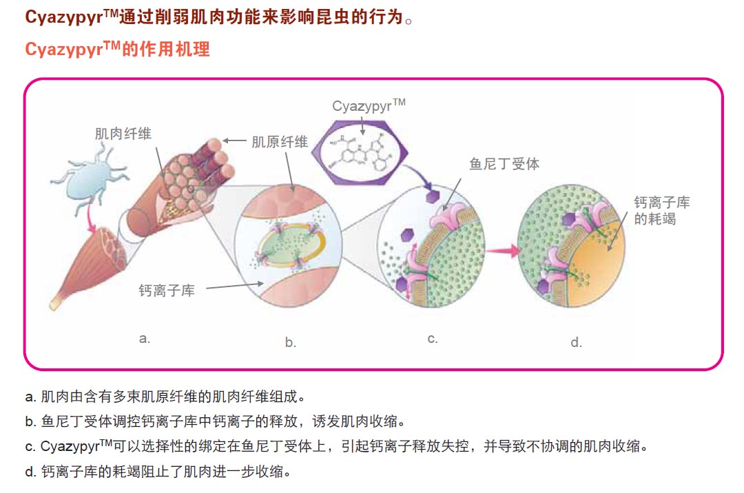 CyazypyrTM能够激活昆虫鱼尼丁受体(RyRs),该受体对肌肉功能起到关键作用。肌肉的收缩需要钙离子从细胞 内钙库中释放到细胞质内。鱼尼丁受体起到选择性离子通道的作用,可控制钙离子的释放。CyazypyrTM分子可以和 鱼尼丁受体结合,导致钙离子的流失,从而阻止肌肉进一步收缩。