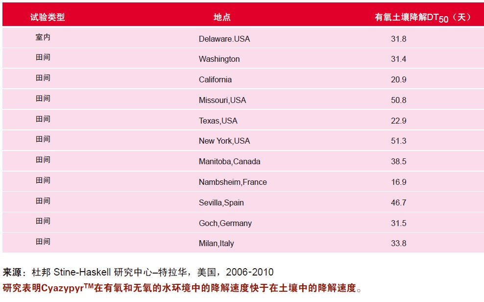 实验室和田间研究都表明CyazypyrTM在多种土壤条件下迅速降解。田间试验得到的DT50值与实验室得到的相当。 在田间条件下,CyazypyrTM主要保持在上部土层,并最终降解为残留物和二氧化碳。在上部土层以外的区域均未检 测到CyazypyrTM及其代谢物。