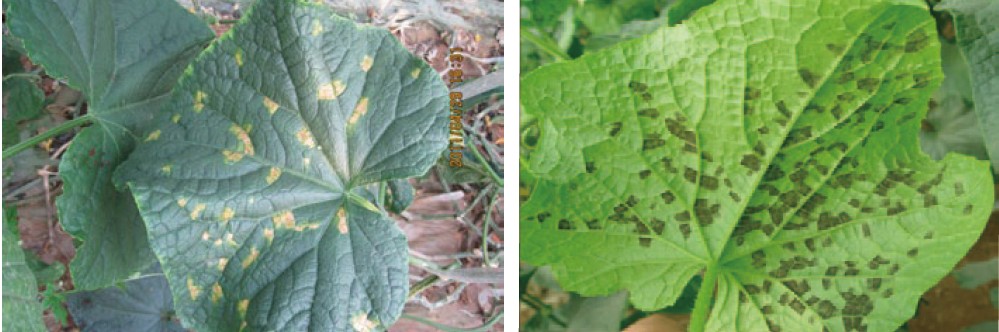 | 霜霉病 Pseudopeonospora cubensis 该病原菌的最适宜发病温度为16-24℃。适宜的发病湿度为85%以上,特别在叶片有水膜时,最易受侵染发病。 叶片反面出现水渍状、淡绿色小斑点,正面不显,后病斑逐渐扩大,正面显露,病斑变黄褐色,受叶脉限制,病 斑呈多角形。在潮湿条件下,病斑背面出现紫褐色、或灰褐色稀疏霉层。 |