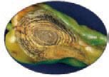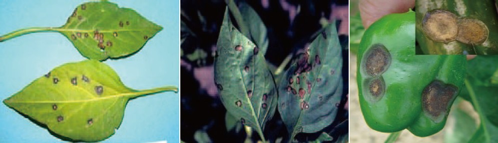 炭疽病 Colletotrichum capsici 该病菌发育温度范围为12-33℃,高温高湿有利于炭疽病发生。染病多发生在老熟叶片上,产生近圆形的褐色病斑,亦产生轮状排列的黑色小粒点,严重时可引致落叶。茎和果染病,出现不规则短条形凹陷的褐色病斑,干燥时表皮易破裂。 |