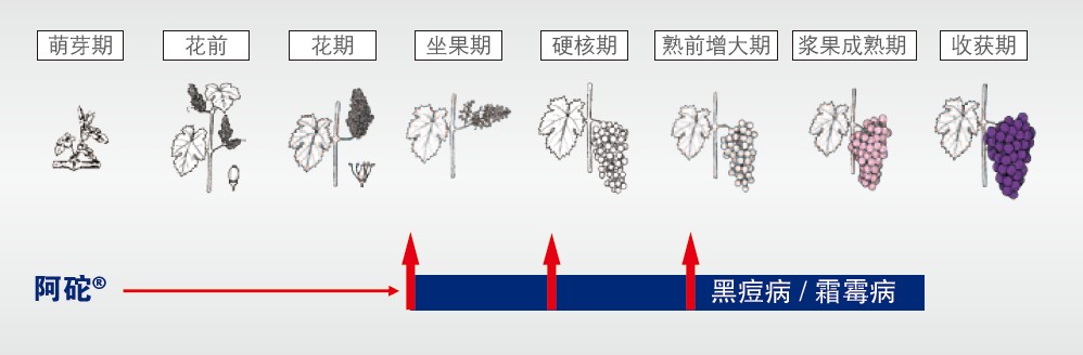 葡萄花后发病前或发病初期使用杜邦TM阿砣®,茎叶均匀喷雾覆盖全株,用药量为1500-2000倍稀释液,用药间隔 7-10天,施用2-3次。