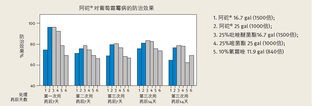 杜邦TM阿砣®16.7-25gal(1000-1500倍液)防治葡萄霜霉病效果与吡唑醚菌酯相当,明显优于嘧菌酯和氰霜唑(蓝色柱状 图代表杜邦TM阿砣®处理)。