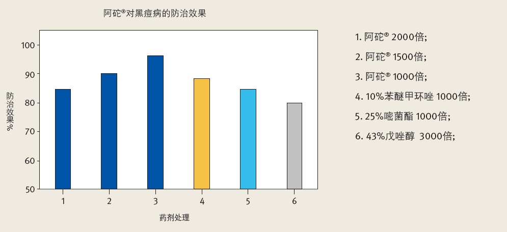 3次药后21天杜邦TM阿砣®1500-1000倍对葡萄黑痘病的总体防效保持在90%以上,显著优于嘧菌酯、苯醚甲环唑和戊唑醇。