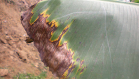 | 叶斑病 Mycosphaerella musicola 病原菌适温是25~29℃,通常在高温多湿时发病严重。叶片上产生中部灰色或灰褐色斑,周缘褐色或黑褐色,多呈椭圆形,纺锤形;病斑背面上生灰色,灰 褐色或暗色霉状物。 |