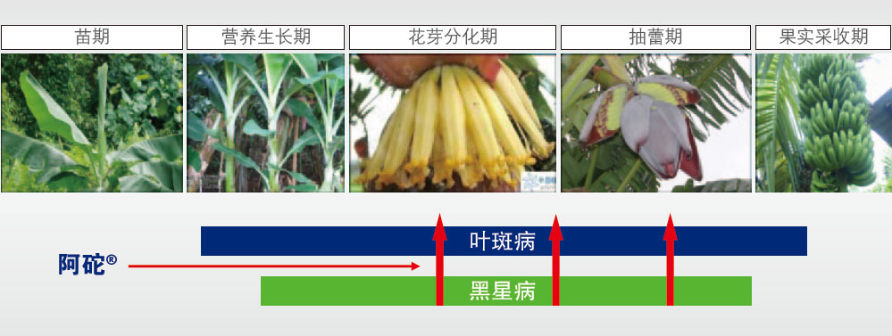 香蕉叶斑病:作物发病前或发病初期使用杜邦TM阿砣®,茎叶均匀喷雾覆盖全株,稀释1500倍 施用,用药间隔15-20天,施用3次。