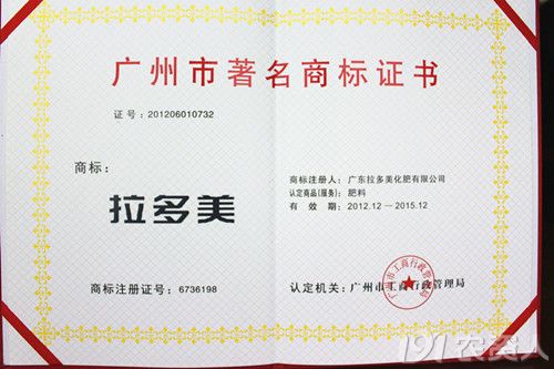 近期,广州市工商行政管理局下发文件《关于认定“拉多美”等98件商标和延续认定“环角”等176件商标为2012年广州市著名商标的通知》(穗工商标【2013】86号),正式认定“拉多美”商标为“广州市著名商标”,这是广东拉多美化肥有限公司继荣获“守合同重信用企业”、“广东省名牌产品”、“高新技术企业”等荣誉后的又一大喜讯。