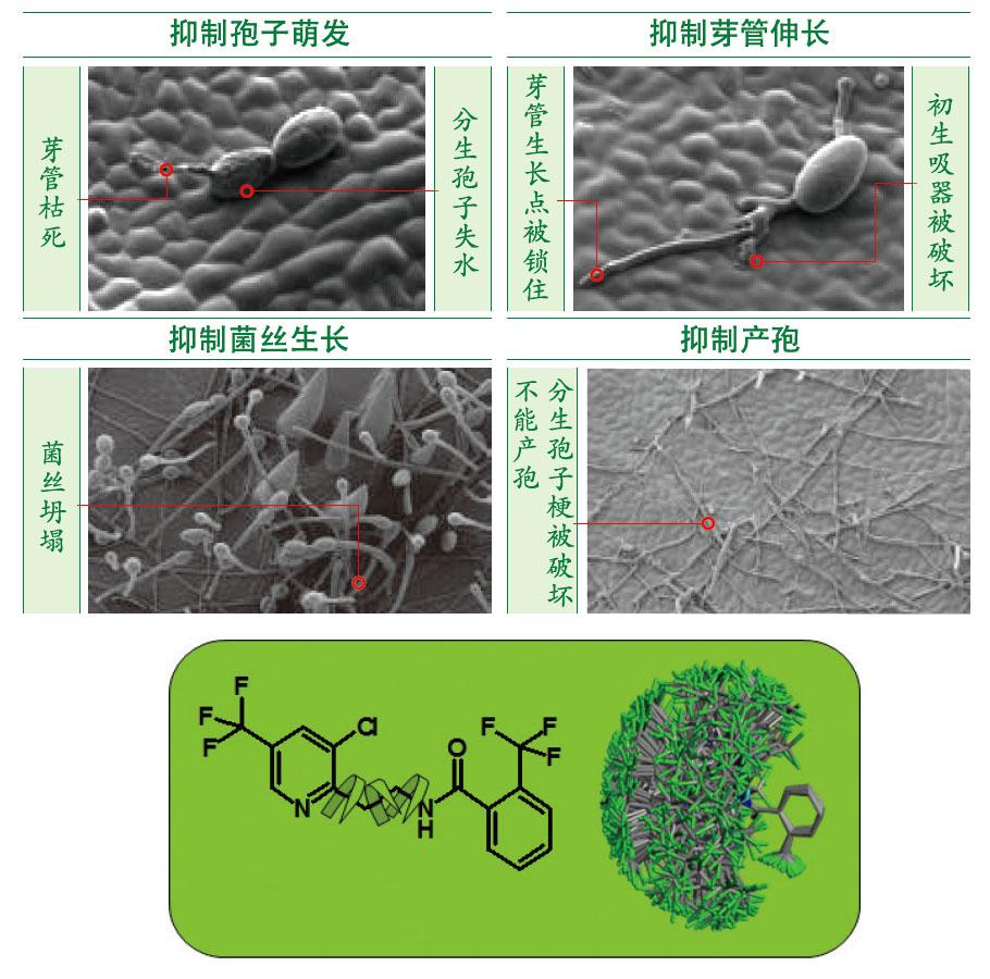 氟吡菌酰胺对多种病原真菌的各发育阶段均有效,同时氟吡菌酰胺特有的“柔性链”结构使病原菌对其不易产生抗性,持久可以信赖,可作为抗性管理的工具。