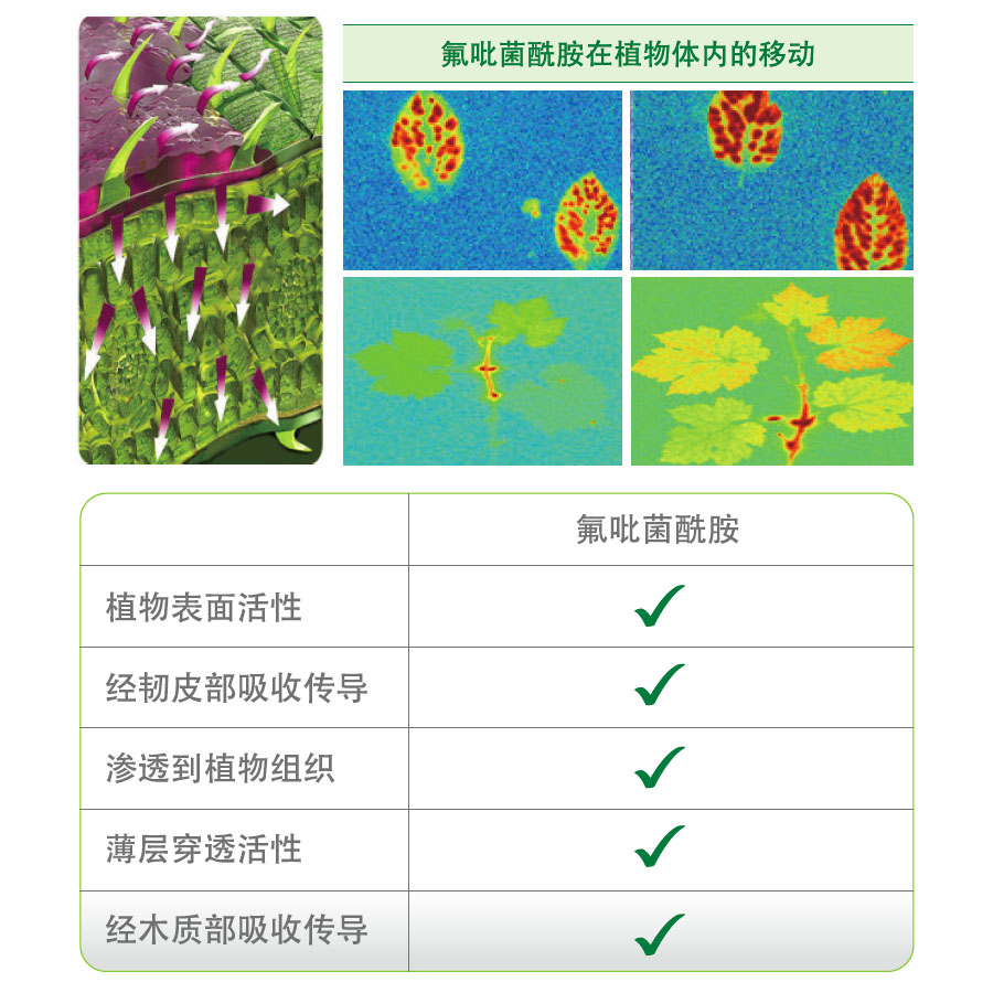 露娜森的活性成分氟吡菌酰胺有薄层穿透活性、维管束传输等多种传导方式,其在植物体内的分布更均匀,从而更彻底的控制病害,并且可以有效地保护新生组织。