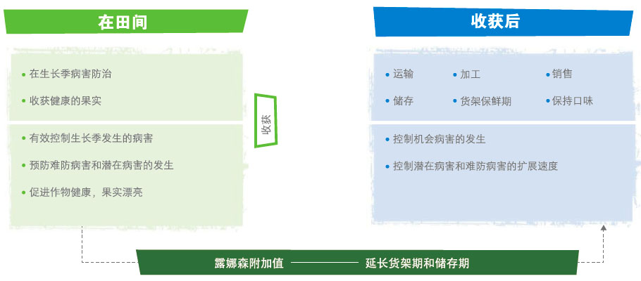 露娜森区别与其他产品的主要特点是,在生长季施用露娜森,病害控制更彻底,同时也预防难防和潜在病害的发生,使果实采收后的病害发生减轻,从而延长了货架保鲜期,降低了运输、储存、货架陈列和购买后的损失,为蔬果从种到购买的各个参与方带来价值。