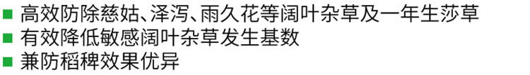 水层管理:施药前排水或确保杂草露出水面2/3以上,施药后及时回水,保持水层3-5厘米,5-7天,切忌淹没水稻心叶