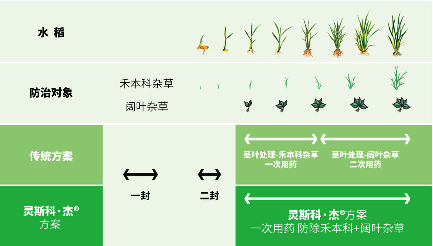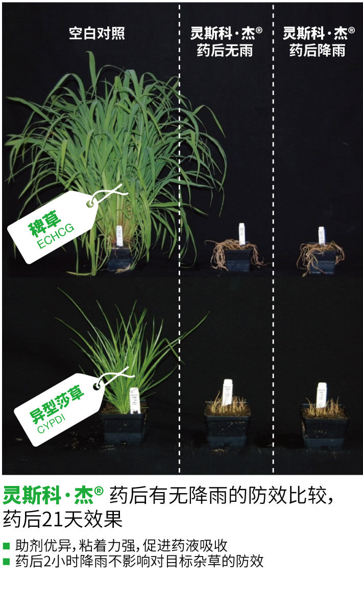 使用方法:灵斯科·杰®100毫升/庙+稻杰®,(适用剂量根据当地情况)均匀喷雾;强烈推荐科学综合治理杂草,在移栽前后进行常规药剂封闭处理