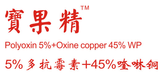 宝果精是兴农药业研发的5%多抗霉素+45%喹啉铜科学复配高科技杀菌剂,该产品中喹啉铜为有机螯合物,对作物更安全,同时具有很好的混配性;另外多抗霉素属于很安全的微生物发酵成份,兴农采用最好的进口原药,能够防治多种病害。二者复配,互补增效,更全面的保护作物。