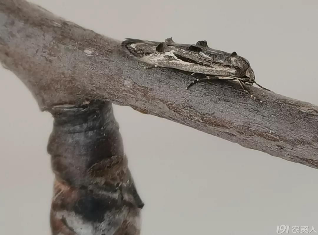 梨瘤蛾又称梨瘿华蛾、梨枝瘤蛾、糖葫芦、梨疙瘩等,它属于鳞翅目,华蛾科昆虫。为了弄清成虫特征和羽化时间我们把虫瘿枝条带回居室进行观察,12月17日把枝条下端插到水瓶中保湿,12月30日开始羽化(见下图),可能是虫蛹受到20多度居室温度的刺激,比田间羽化时间提前了许多。