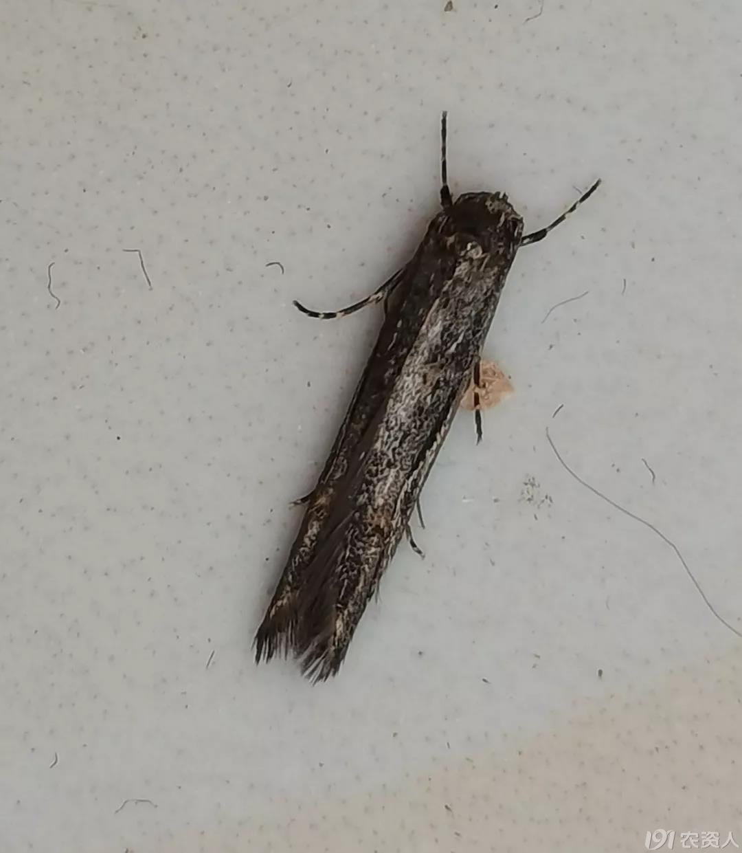 成虫:体长5~8mm,翅长12~17mm,银灰至灰褐色,略有光泽,下唇须很长向前伸弯曲呈镰刀状,复眼黑色,触角丝状,基部较粗大。前翅灰黑色,密布灰白色小点,近基部引出两条褐色纵纹,在外缘近中央部分和臂角上各有一茶褐色至灰色突起的鳞片,中室附近及顶角处各有一黑色短纹,两纹相接成“八”字形,后翅灰白至灰褐色,前后翅缘毛均很长,足较体色深为暗褐色。