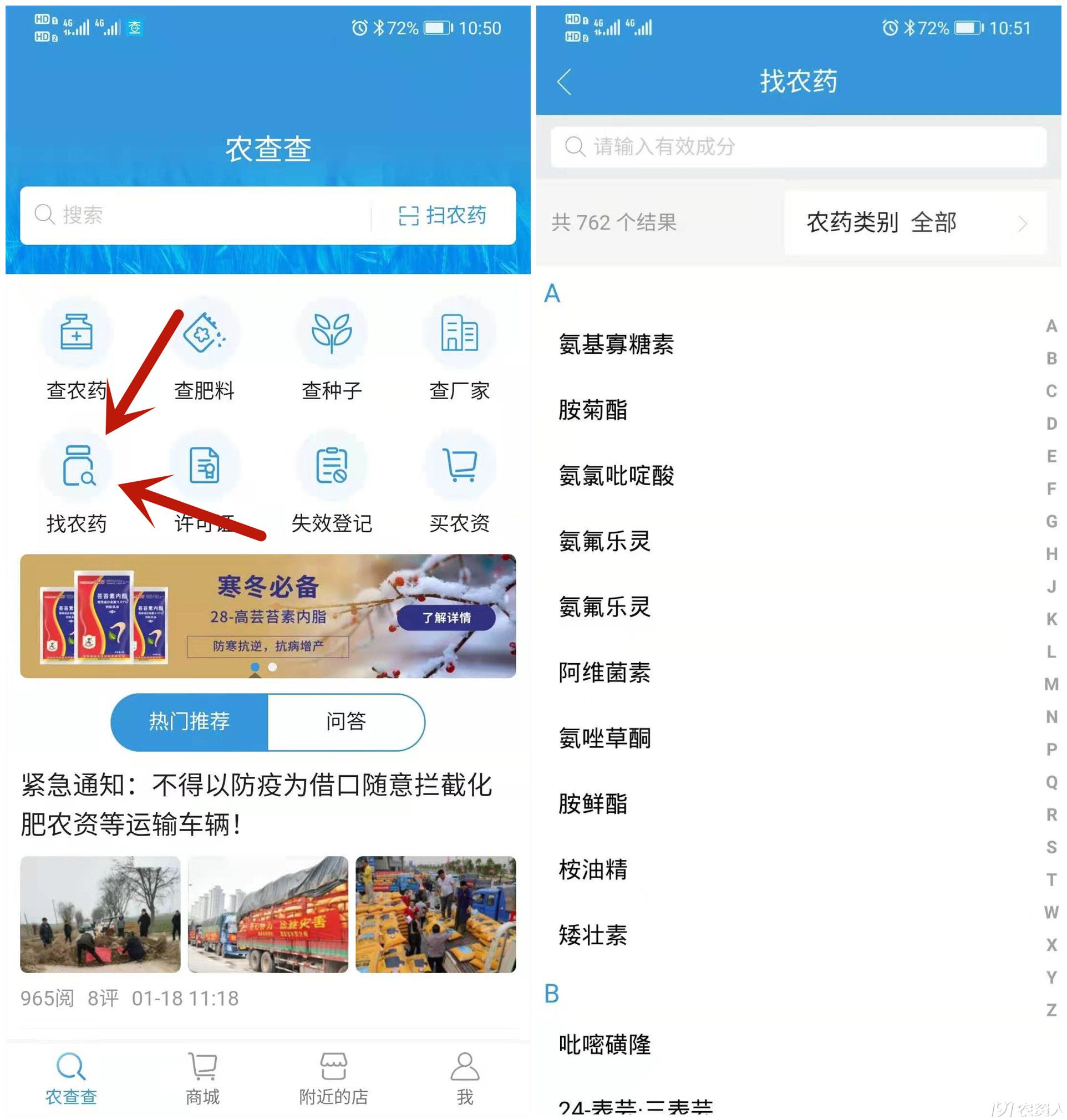 打开农查查APP,首页就有“找农药”板块,点击进去该板块,系统会根据农药成分的拼音首字母,从A-Z排列,用户可以根据自己想找的农药成分,点击相应的字母,快速筛选有效成分。