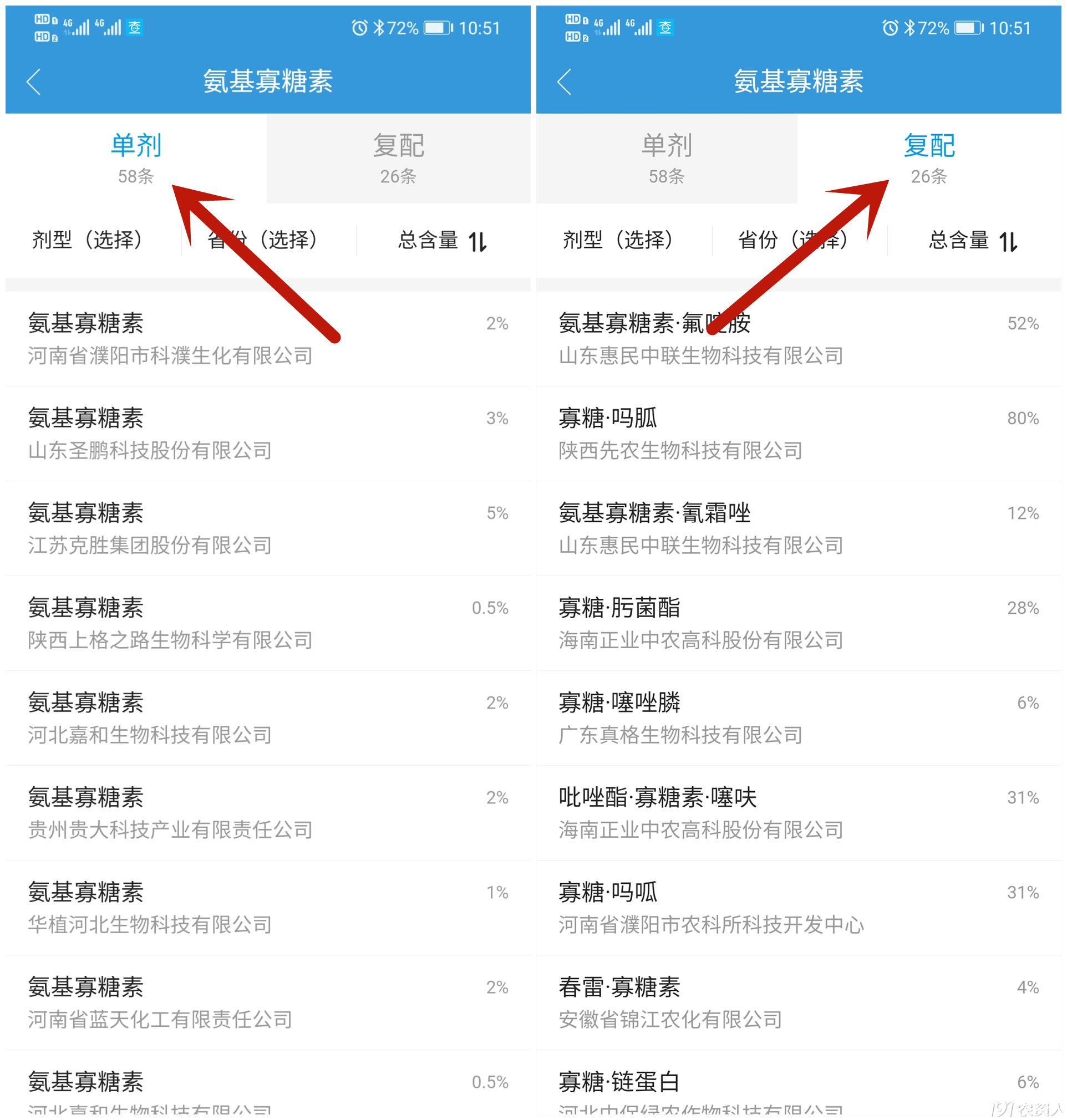 以氨基寡糖素为例,界面会有两种分类方法,左图为登记的氨基寡糖素单剂列表,右图为与氨基寡糖素相关的复配剂型,并且显示数量。