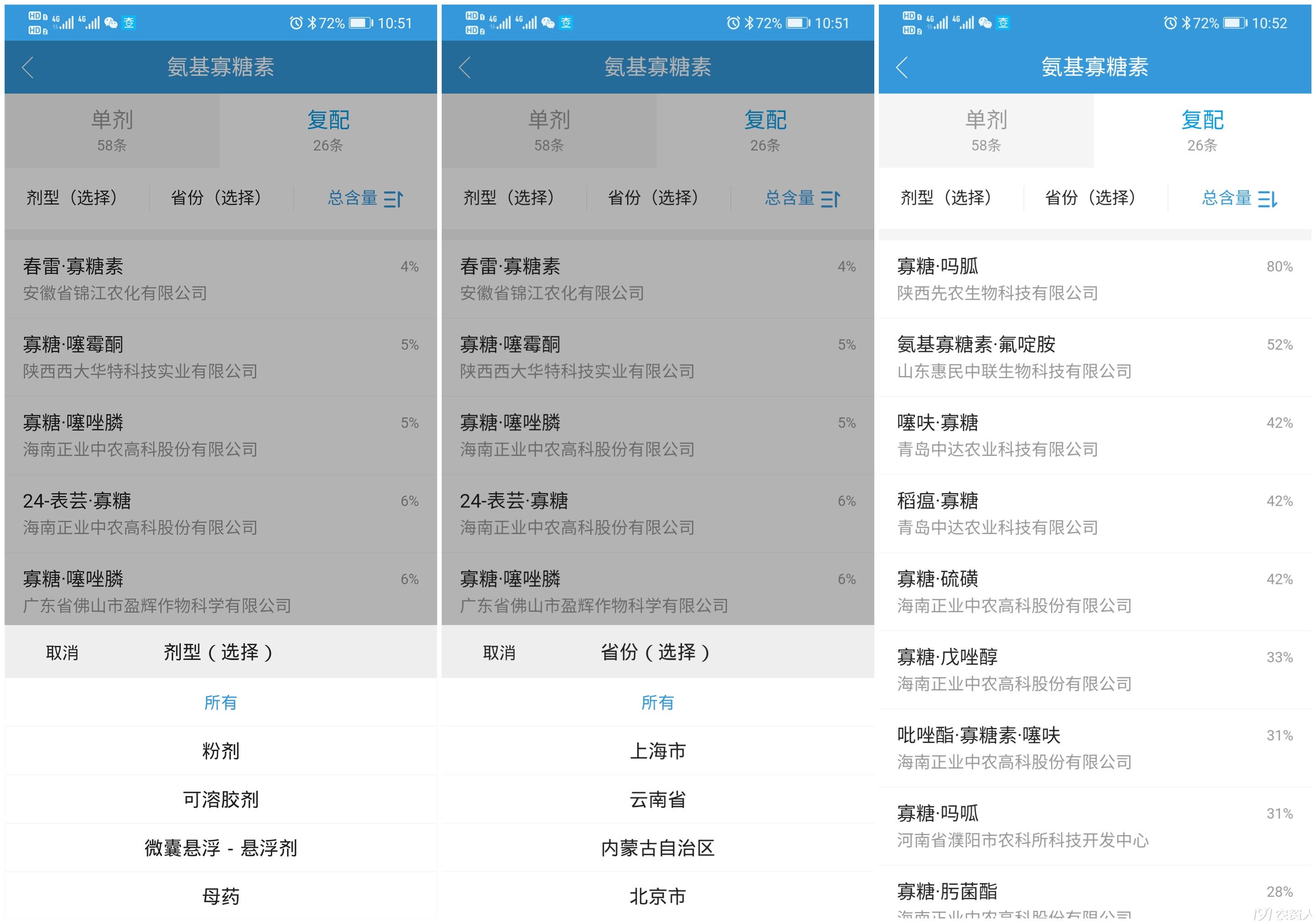 单剂和复配剂型都可以更加精确的筛选,用户可以根据剂型、省份、含量排序三个维度,精准找到您所需要了解的农药成分信息。