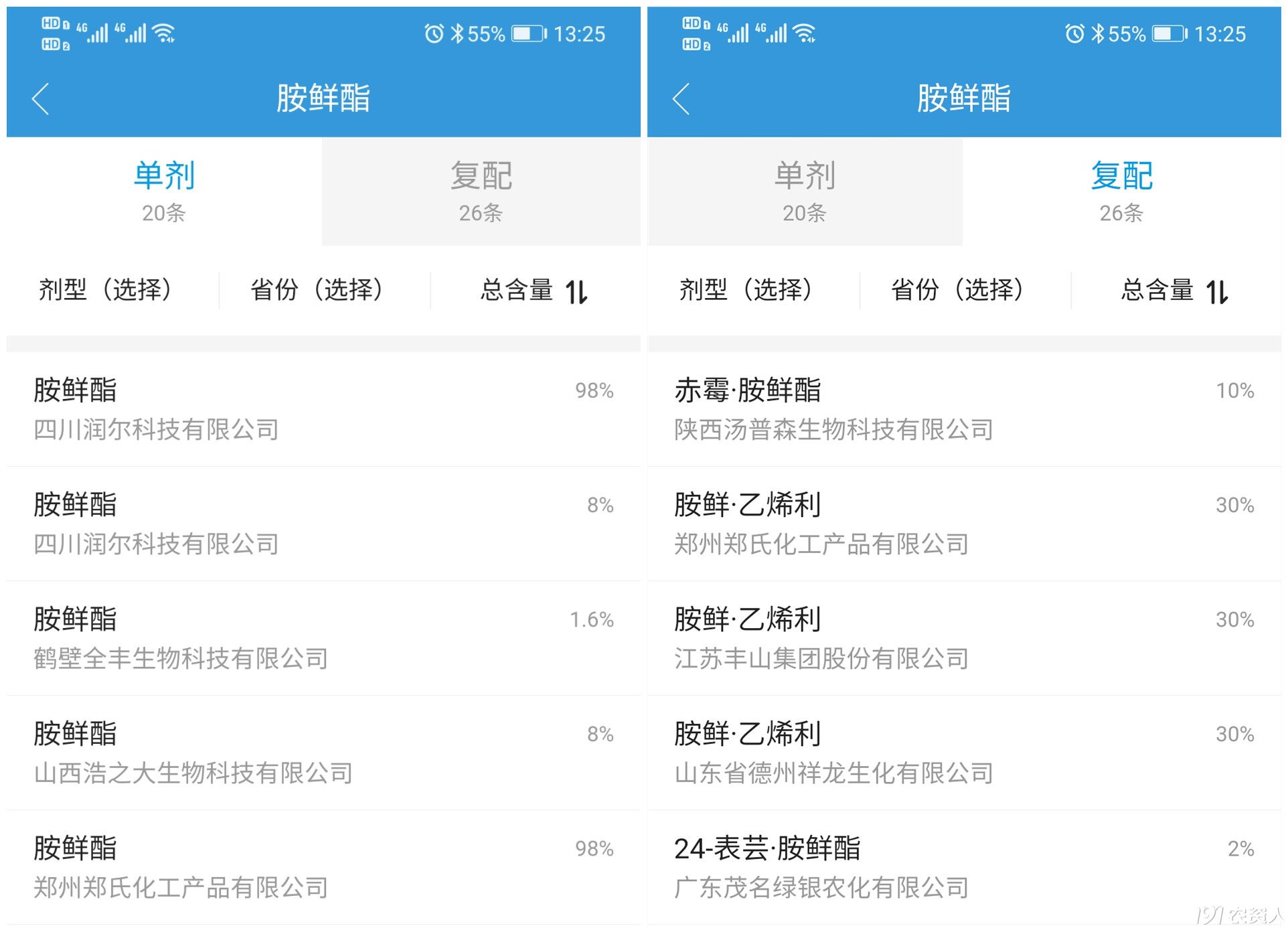 以胺鲜酯为例,界面会有两种分类方法,左图为登记的胺鲜酯单剂列表,右图为与胺鲜酯相关的复配剂型,并且显示数量。