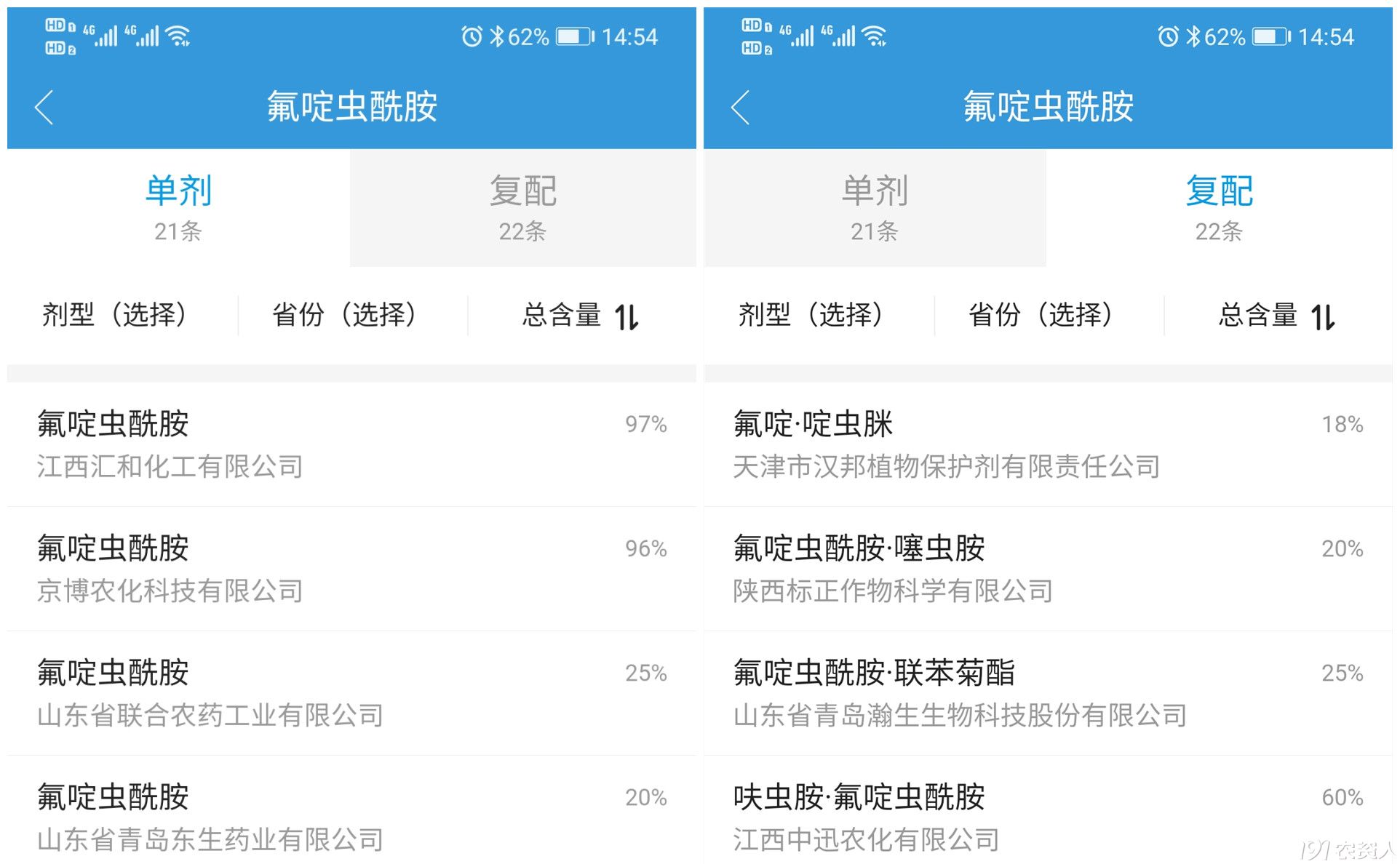 界面会有两种分类方法,左图为登记的氟啶虫酰胺单剂列表,右图为与氟啶虫酰胺相关的复配剂型,并且显示数量。