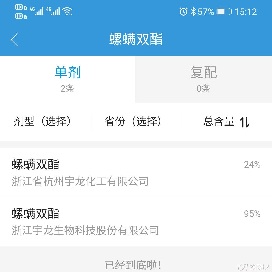 界面会有两种分类方法,左图为登记的螺螨双酯单剂列表,右图为与螺螨双酯相关的复配剂型,并且显示数量。