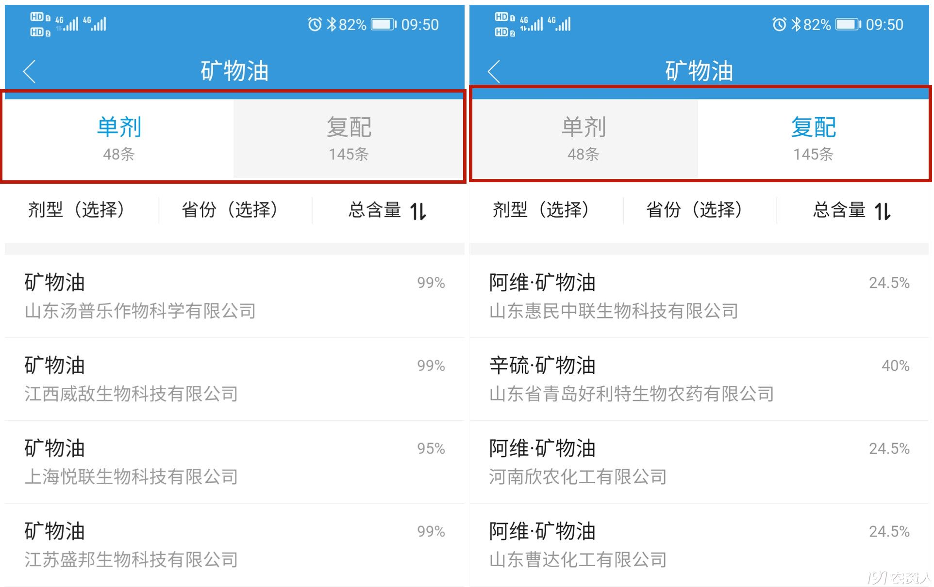 界面会有两种分类方法,左图为登记的矿物油单剂列表,右图为与矿物油相关的复配剂型,并且显示数量。