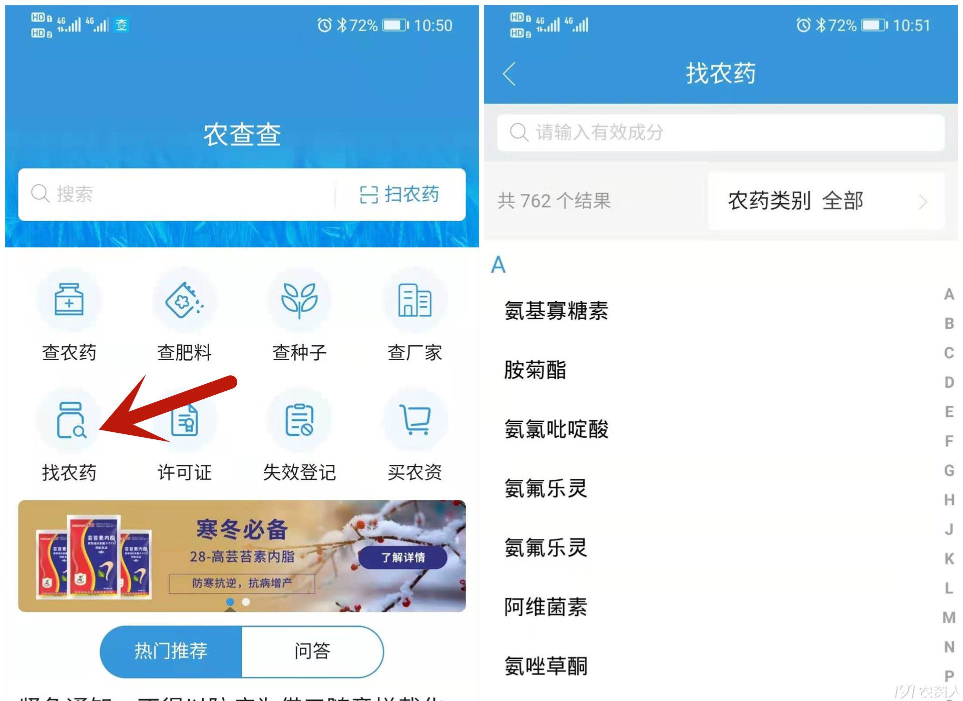 打开农查查APP,首页就有“找农药”板块,点击进入该板块,系统会根据农药成分的拼音首字母,从A-Z排列,用户可以根据自己想找的农药成分,点击相应的字母,快速筛选有效成分。