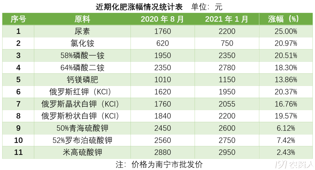 二是氮肥生产原料紧缺。氮肥生产最初原料为氨气,国内合成氨生产企业主要采用天然气或煤作为主要能源,由于2020年12月及2021年1月,连续多次的冷空气影响,为了保障居民正常供暖,优先供应天然气给居民使用,导致合成氨生产企业原料受到影响,导致工厂阶段性停产价格上涨。三是国际贸易的不确定性,导致国内硫铁矿、硫磺、焦炭货源紧俏,价格上涨。磷肥生产的主要原料为硫酸、焦炭、磷矿石等,硫酸、焦炭的原料价格上涨,导致了磷肥的价格上涨。焦炭从去年10月20日的1878元/吨涨到今年1月22日的2548元/吨;硫酸从去年10月9日的381元/吨涨到12月7日的569元/吨,今年1月11日回落至462元/吨。