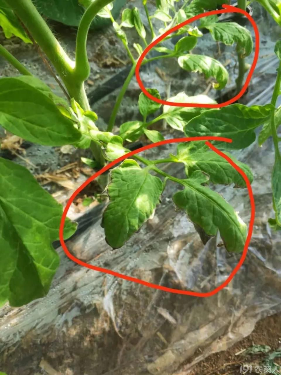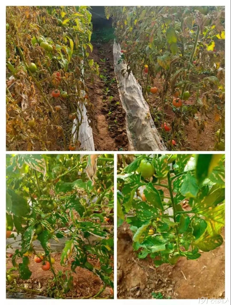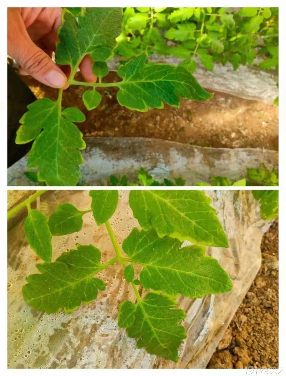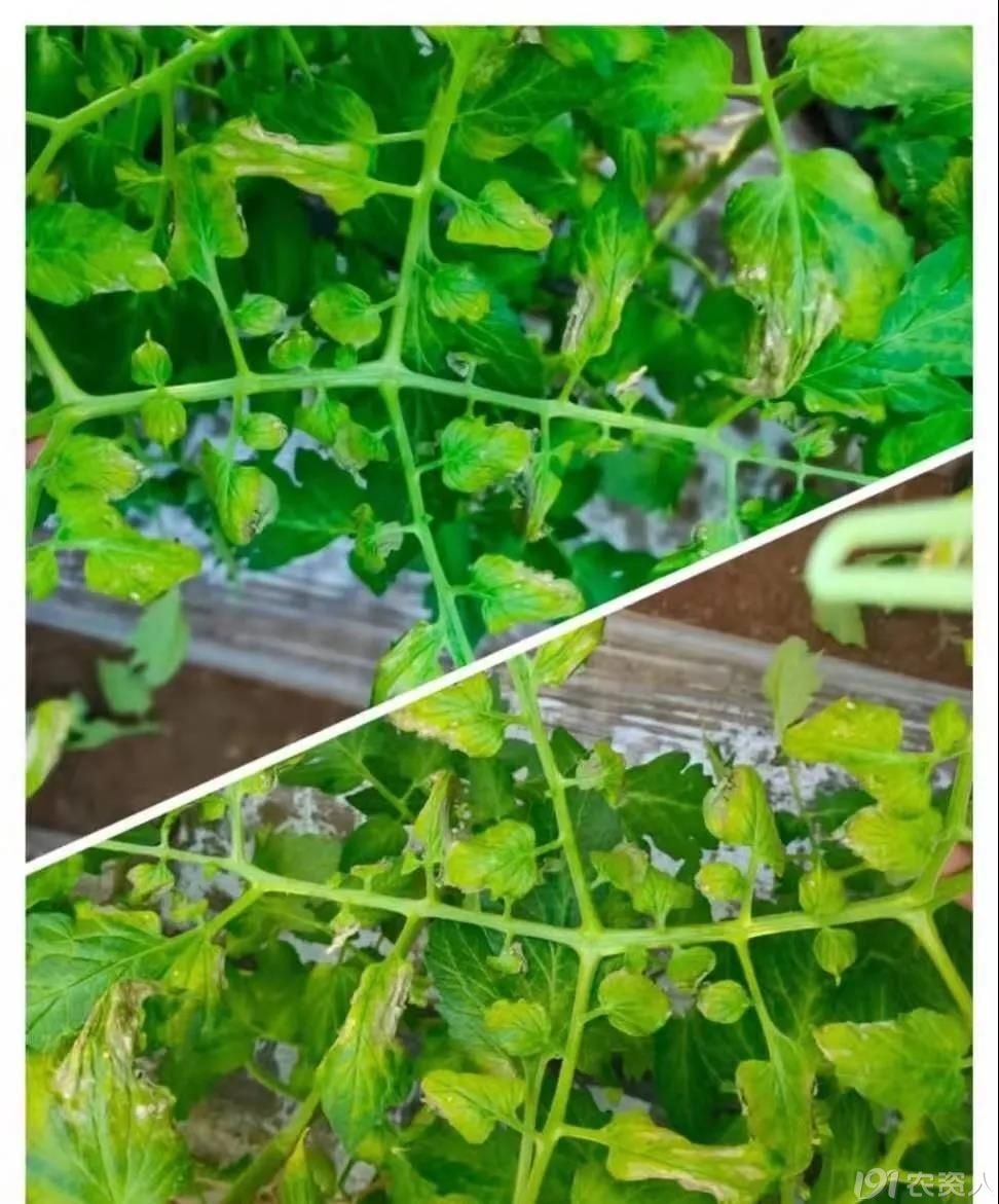 上面这两张图片是冲完肥四天后的症状,整棚番茄的底部叶片边缘都出了问题,原因是低温期冲施了含铵态氮的化学肥料造成的气害。缓解是把地膜向上揭起,加大通风口,叶片喷施海藻或者氨基酸,再次冲肥时带海藻缓解肥害快。