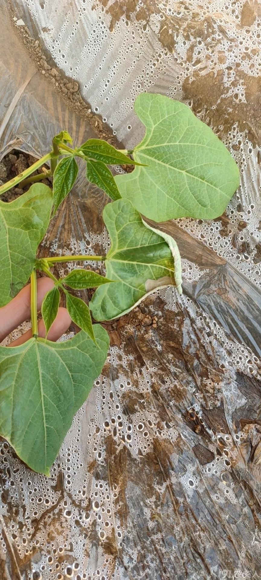 上图是风害。棚室豆角放风要非常注意,根系弱温度极高在突然放开风口造成叶片突然失水。