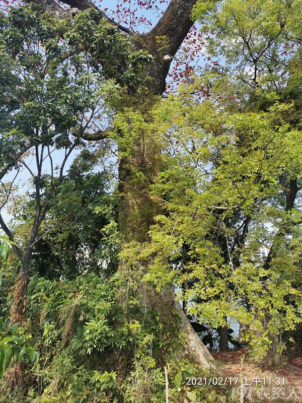 有路可靠近,旁边有菜地以及大管道,树上挂有牌,两棵都是有320多年的树龄,推算是康熙年间种的木棉树。较为粗壮那棵的旁边有一棵断了只剩下树头的木棉,也许年代更加久远,有人烧香膜拜,成了树神。未及细看,那树头也许是水泥墩,膜拜的是活的老木棉树。站在树下,给人一种安宁、安祥的感觉,也许是心理作用,三百多年的老树下,百岁老人都是孩童,何况是中年人。