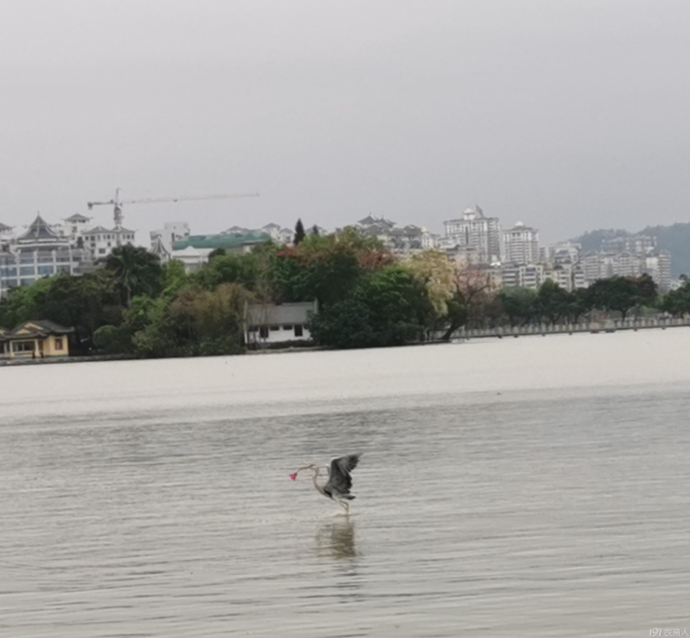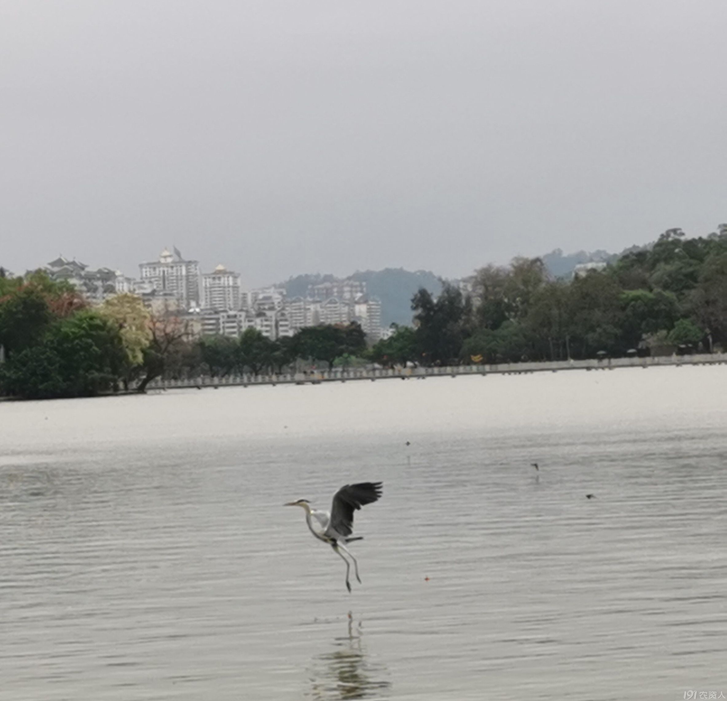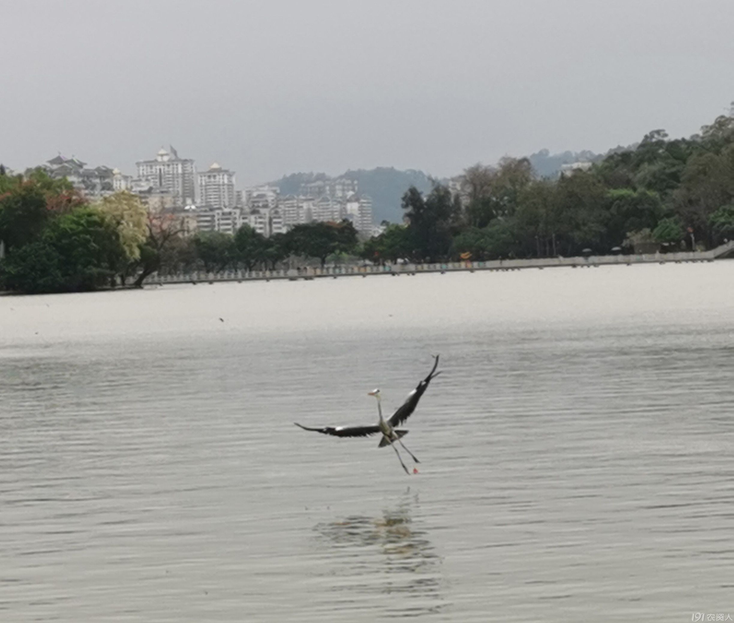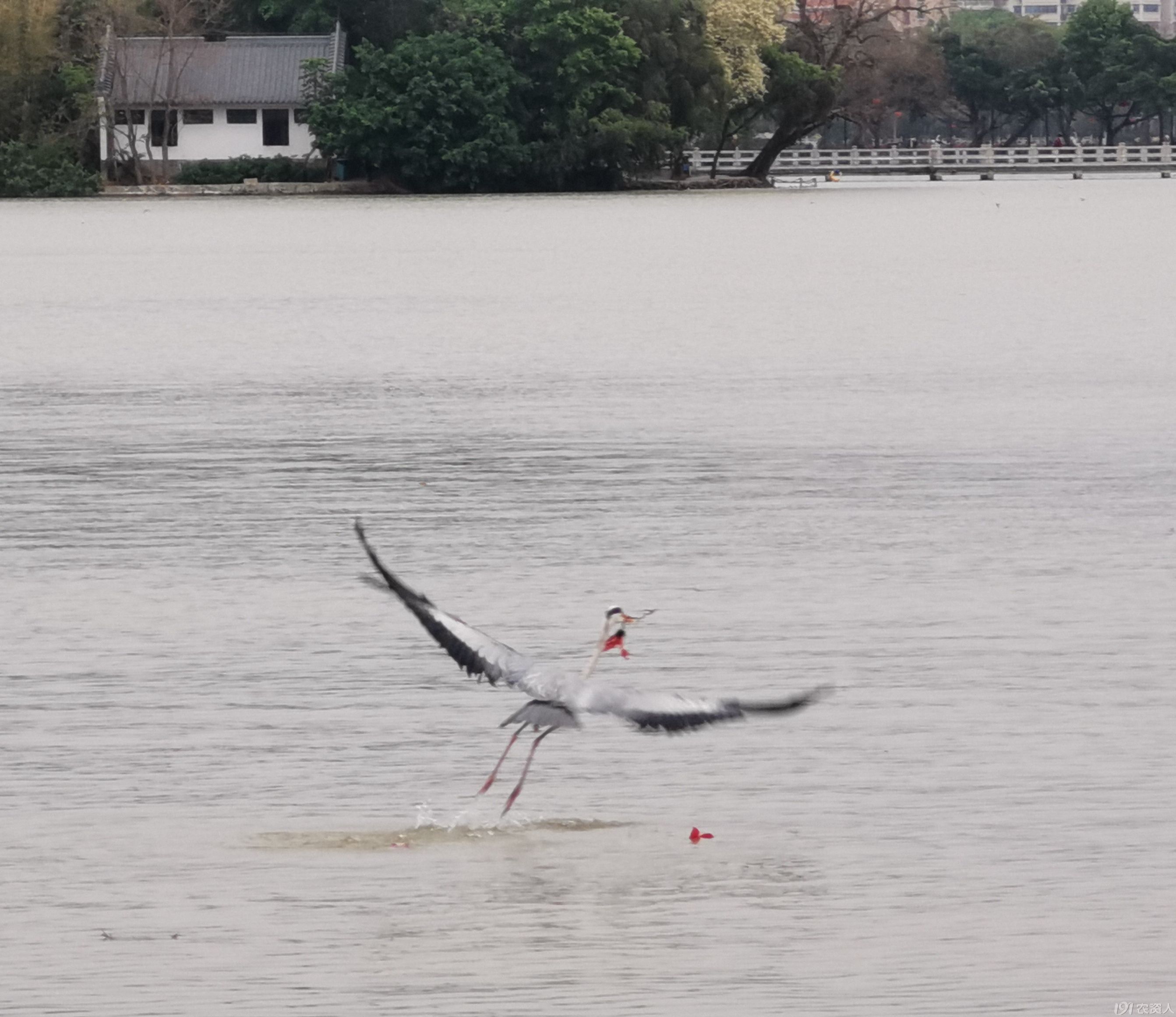 望远处,一只苍鹭飞到摄影爱好者面前,在水上似跳舞,之后又飞到我们面前的水上,身姿轻盈矫健,引起游人的惊呼,驻足观赏。