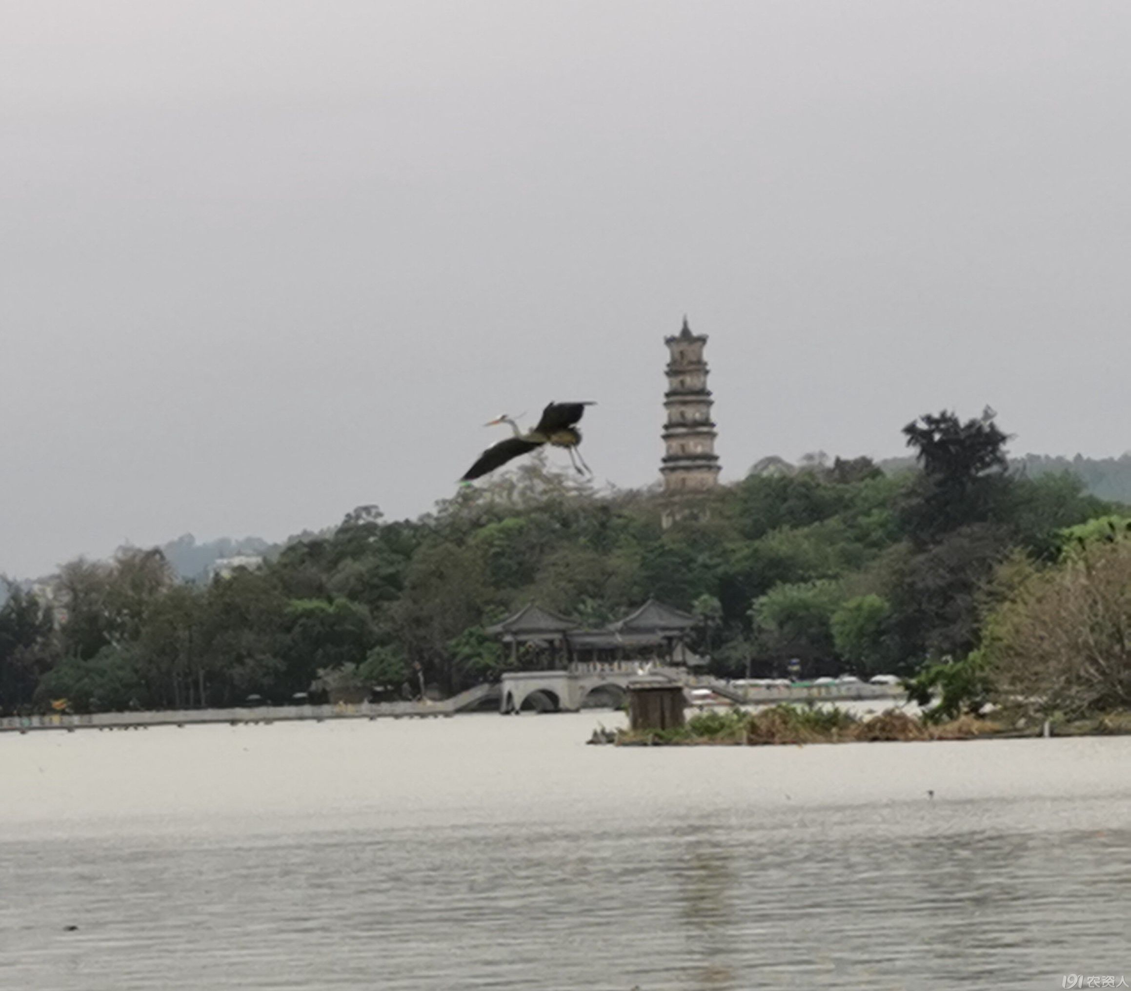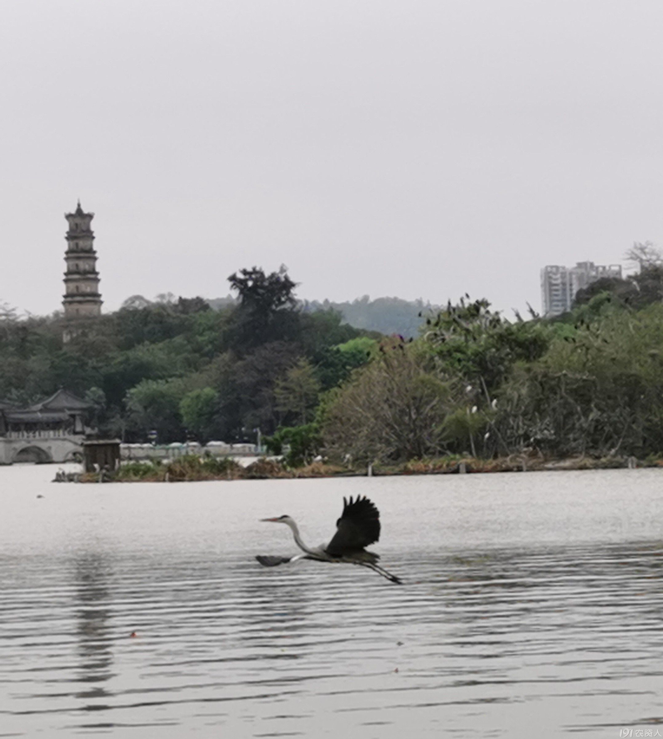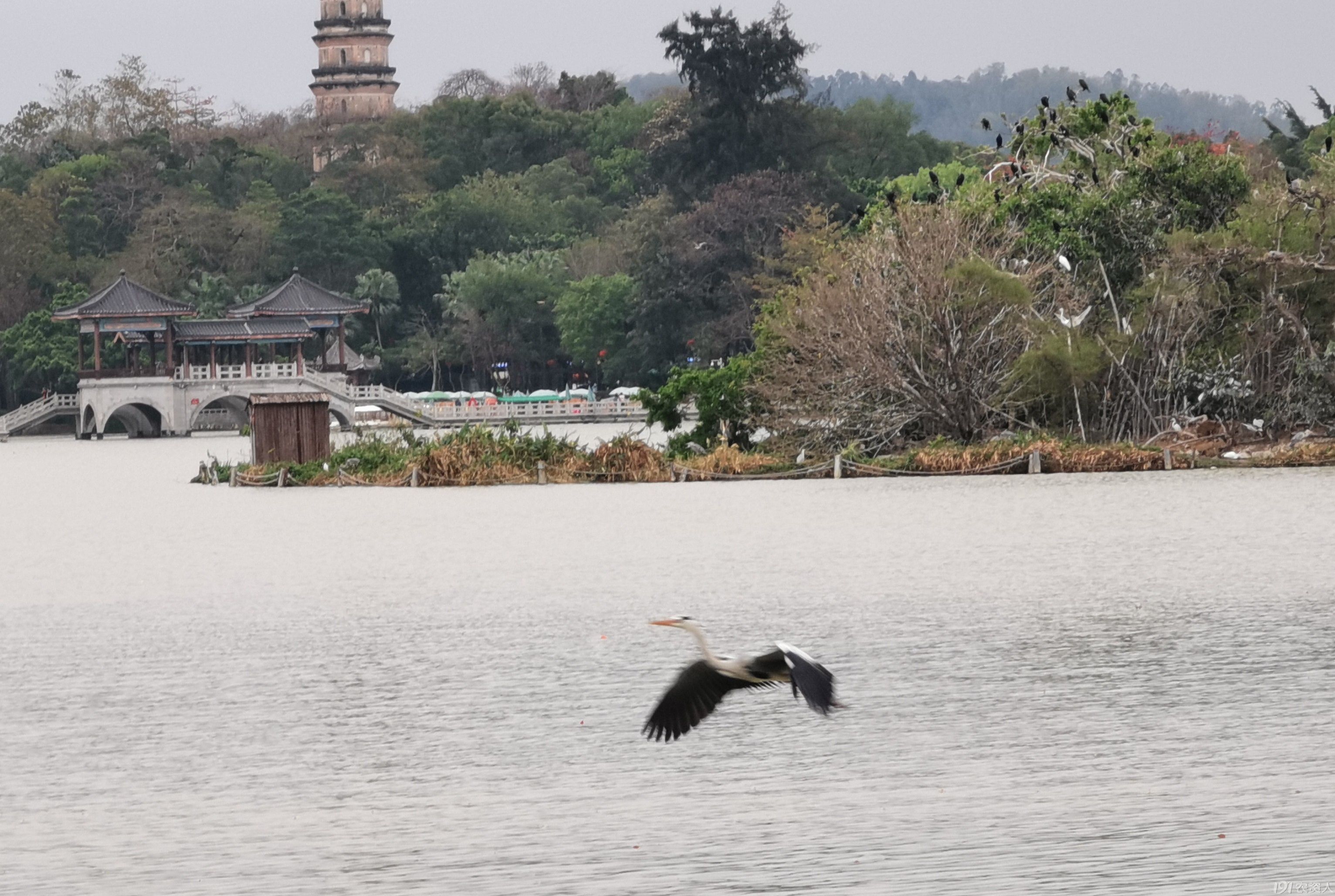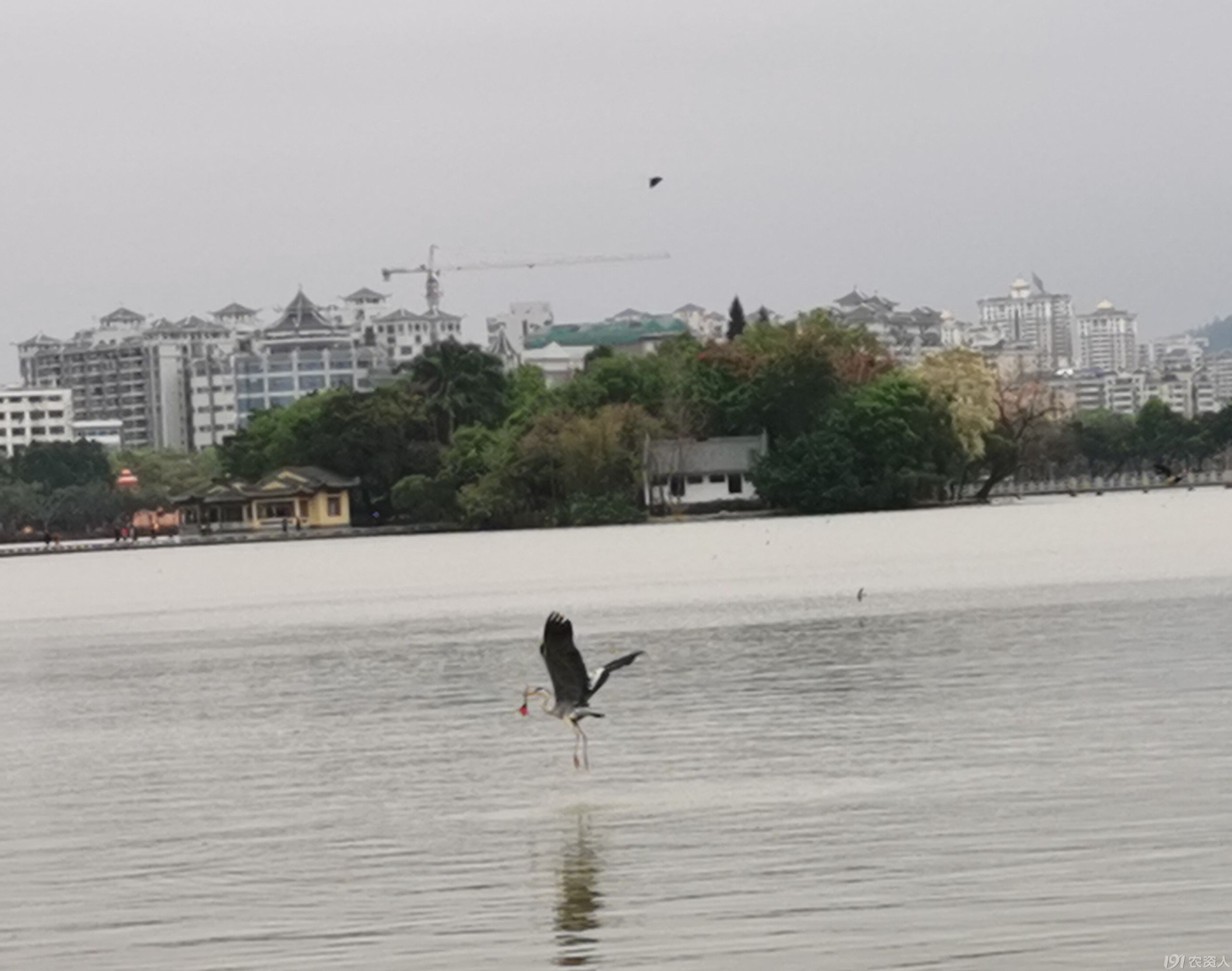 望远处,一只苍鹭飞到摄影爱好者面前,在水上似跳舞,之后又飞到我们面前的水上,身姿轻盈矫健,引起游人的惊呼,驻足观赏。