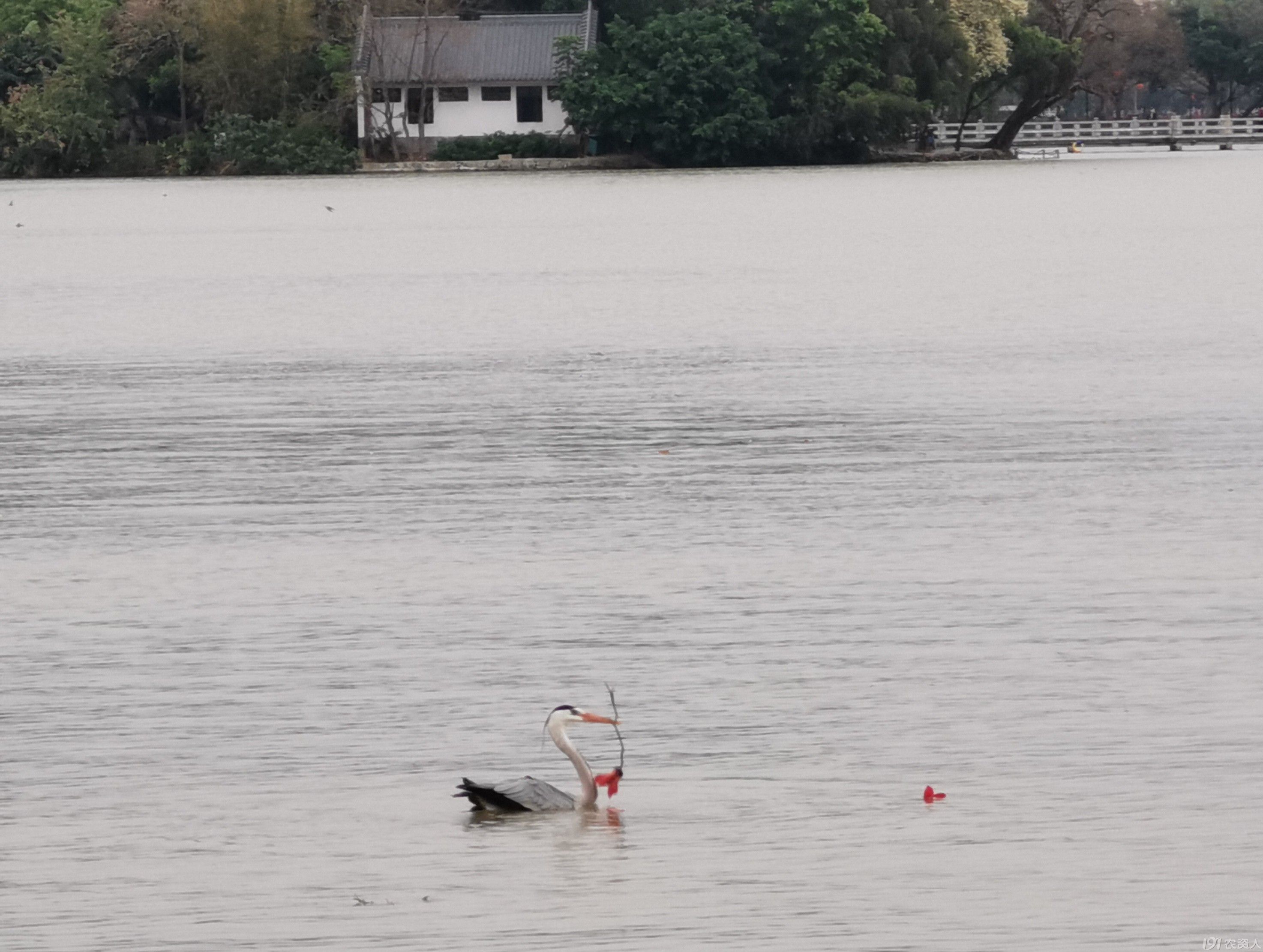 摄影爱好者摘来小树枝,并拾了地上的木棉花串在一起,再投入湖水里,苍鹭很快发现并飞过来,摄影爱好者早就调好镜头等在那里,“啪、啪、啪”地按下了快门。人鸟合作,各有所得,旁人也收获了喜悦的心情。