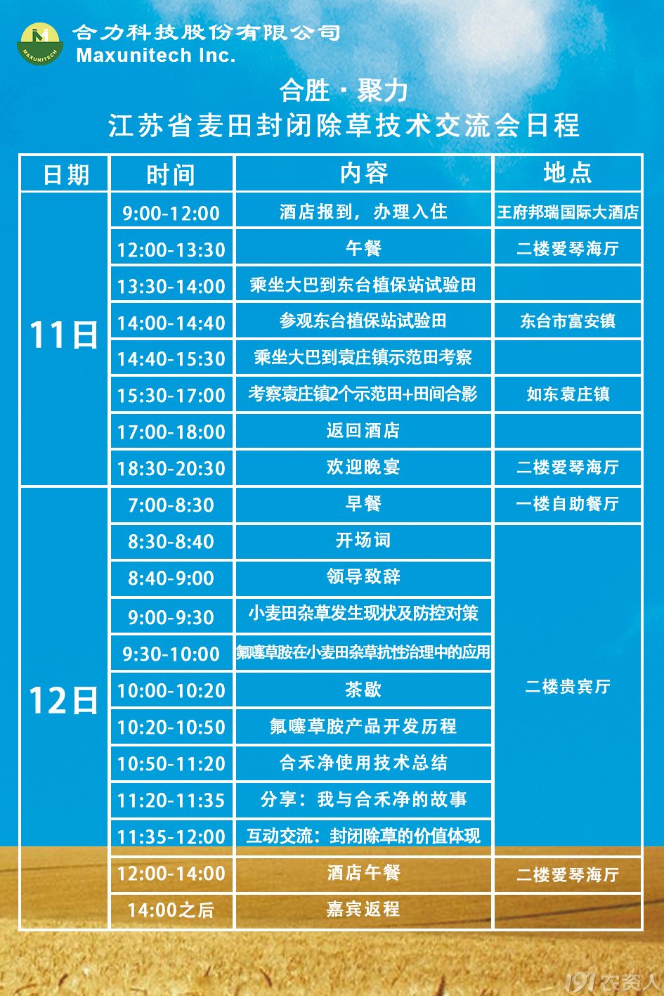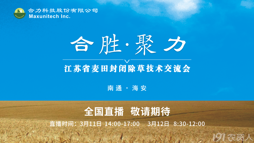 2021年3月11日-12日,合力科技将于江苏南通海安王府邦瑞国际大酒店举办“江苏省麦田封闭除草技术交流会”。特邀江苏各县市经销商、种植大户,业内专家、学者到场,共同探讨麦田抗药性杂草治理方案。