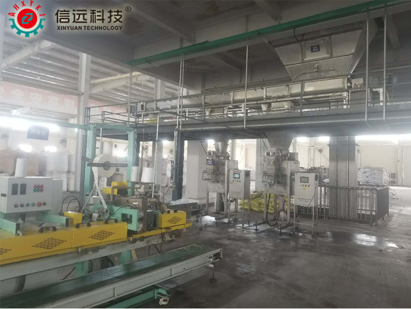 人工平台拆包、直接投料原料仓(除尘)―→矢量法自动配料―→混合机―→自动混合均匀―→自动卸料至定量成品料仓(料位自动控制)--→多点供料螺旋―→缓冲料仓―→人工套袋―→自动称重计量―→自动充填―→称好―→自动落袋―→输送→热封口―→人工装箱。