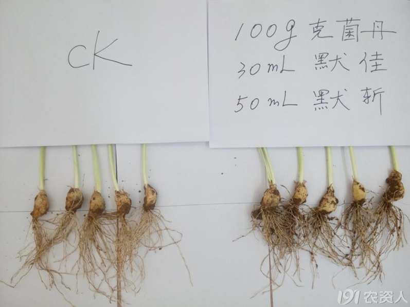 图注:左侧为CK状态下根系状态,右侧为默靓®复配其他药剂土壤处理后根系状态