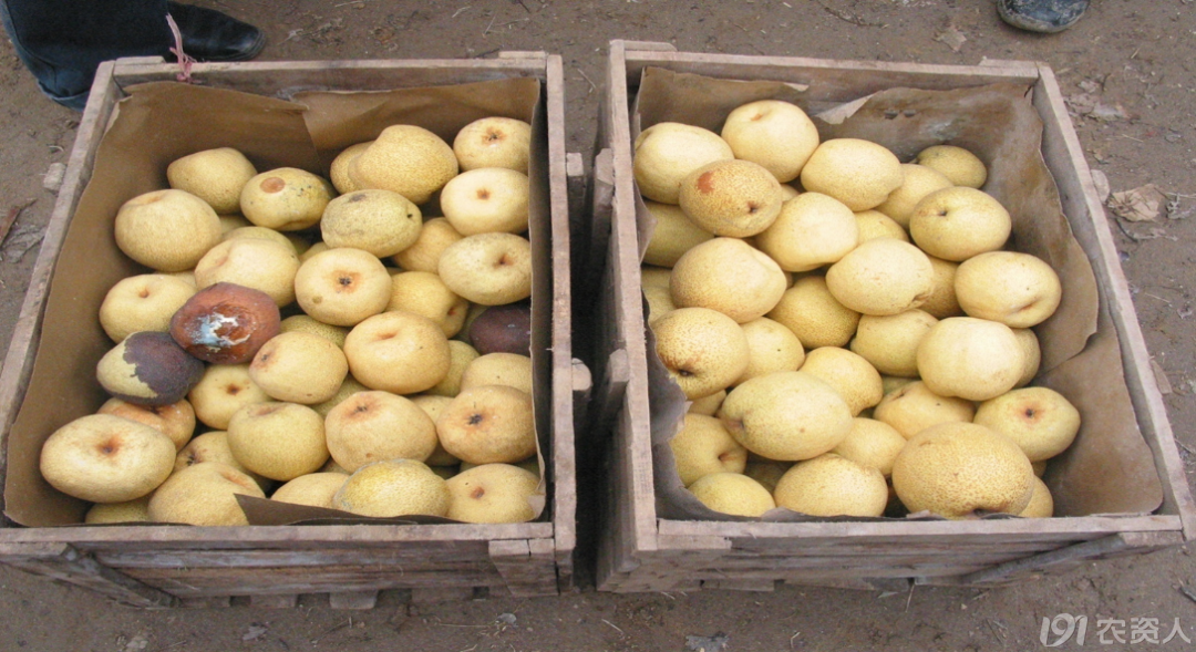 图注:左侧没有喷施克菌丹贮藏一个月,右侧为默靓®使用后贮藏一个月