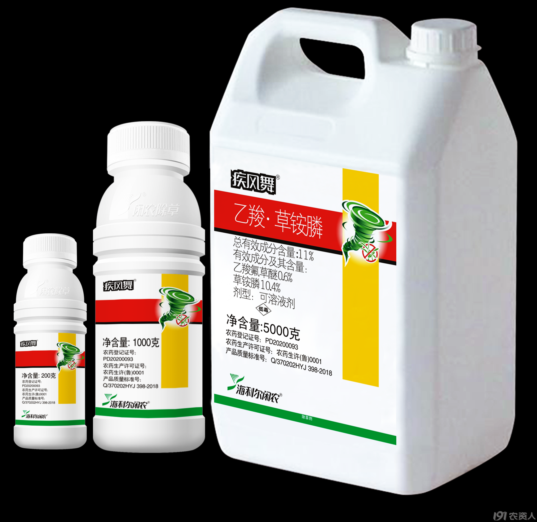 疾风舞®是海利尔闲农2020年投入市场的一款新型超快灭生性除草剂,采用纳米蓝特殊工艺,为全国第一批下证的可溶液剂除草剂。有效成分以草铵膦为主,搭配有乙羧氟草醚。杀草谱特别广,入水后完全透明,有蓝色荧光,属于纳米级粒径,粒径非常小,渗透性、布展性能突出,且耐雨水冲刷,对杂草叶面具有高度润湿性和穿透性,快速到达作用靶标,杂草可迅速吸收产生药效,死草更快更彻底,且持效期长,安全不伤根。