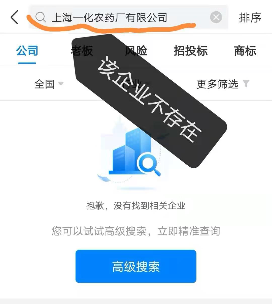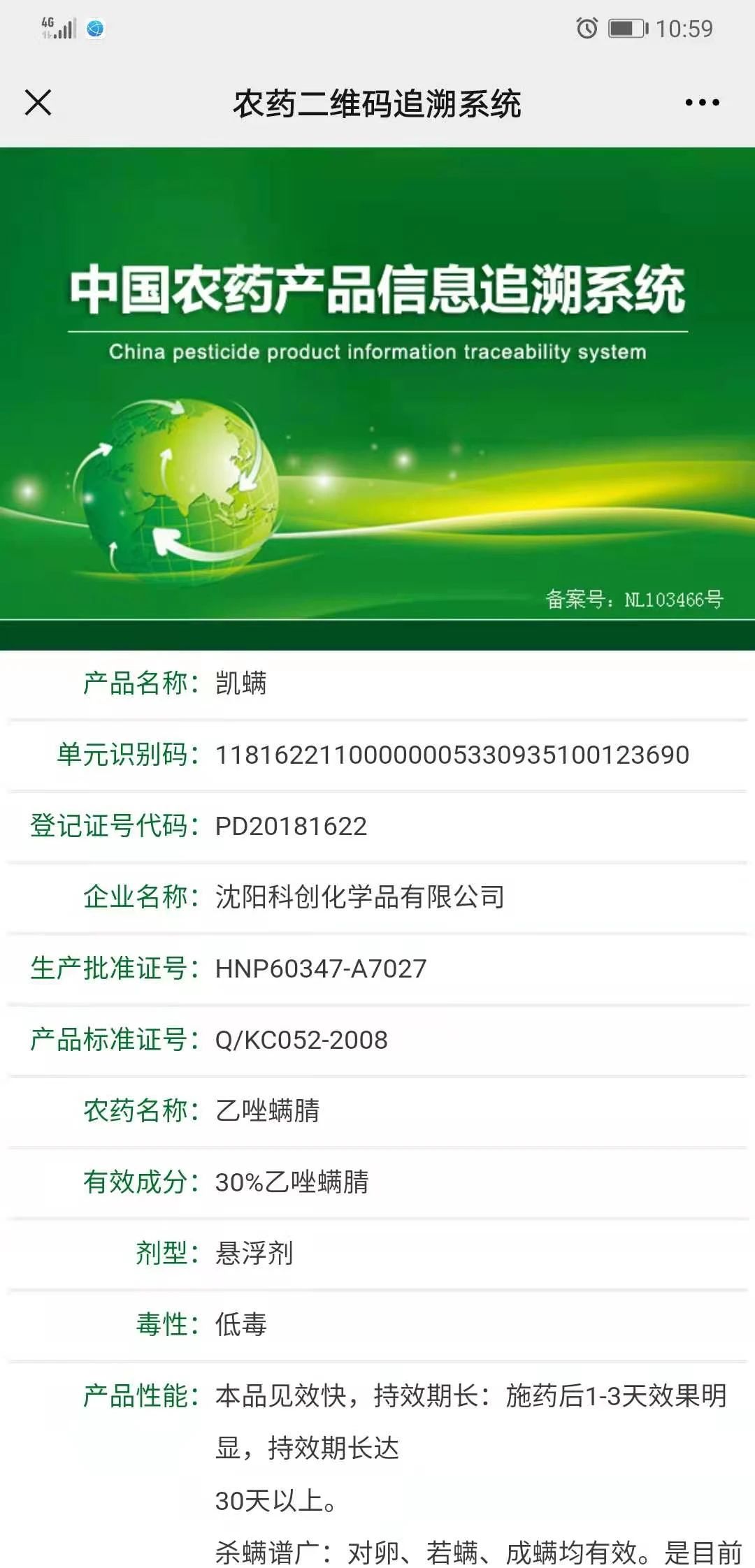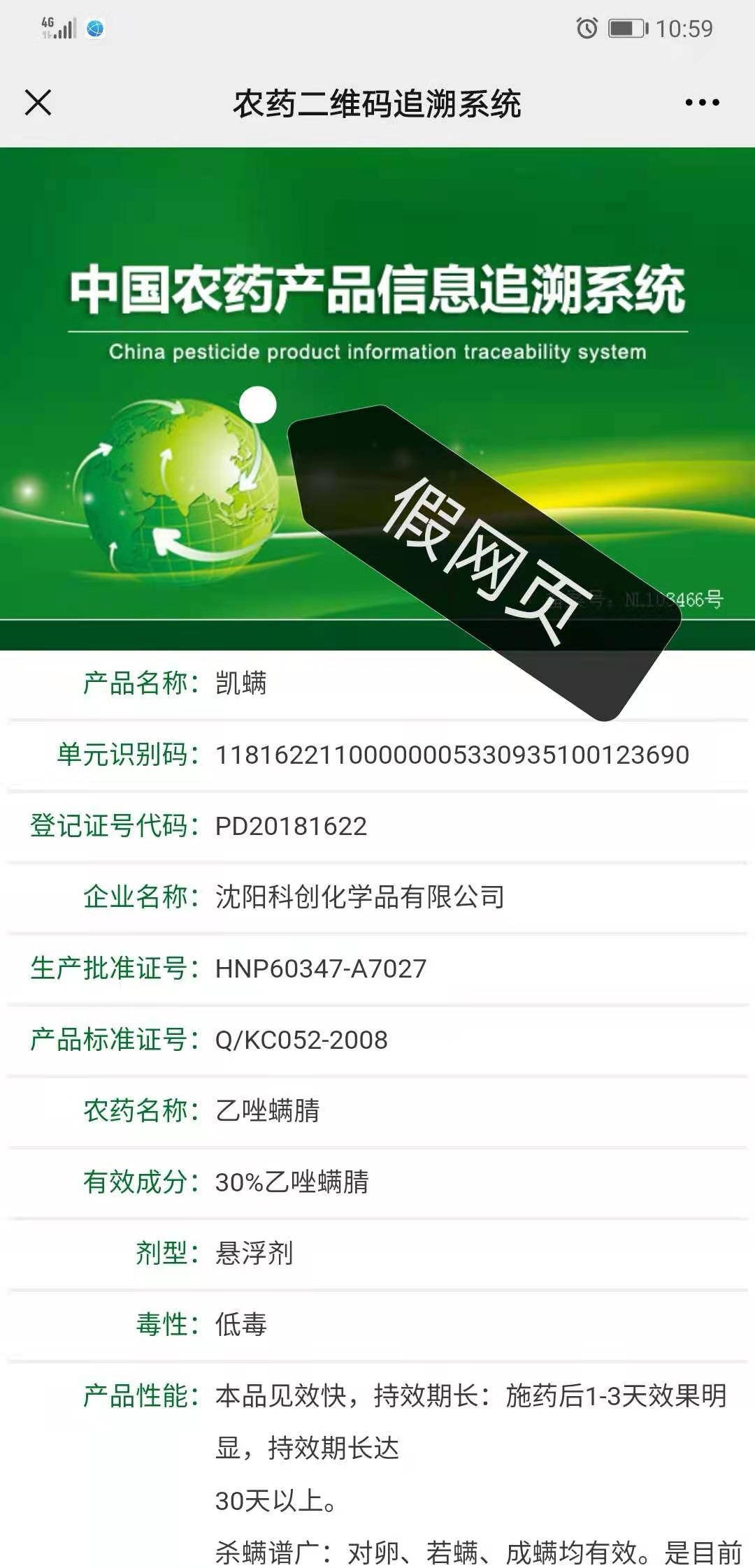 二维码识别“凯螨”,出现“中国农药产品信息追溯系统”网页,输入“中国农药产品信息追溯系统”到百度引擎搜索,并没有查询到该网页,通过二维码扫描识别,该网页依然存在,该网页实为非法,多项信息,涉嫌抄袭中化旗下沈阳科创化学品有限公司,瓶底“上海一化农药厂有限公司”,没有任何资质和权利生产“乙唑螨腈”化合物,通过企业查询系统,输入“上海一化农药厂有限公司”,网页显示“抱歉,没有找到相关企业”。
