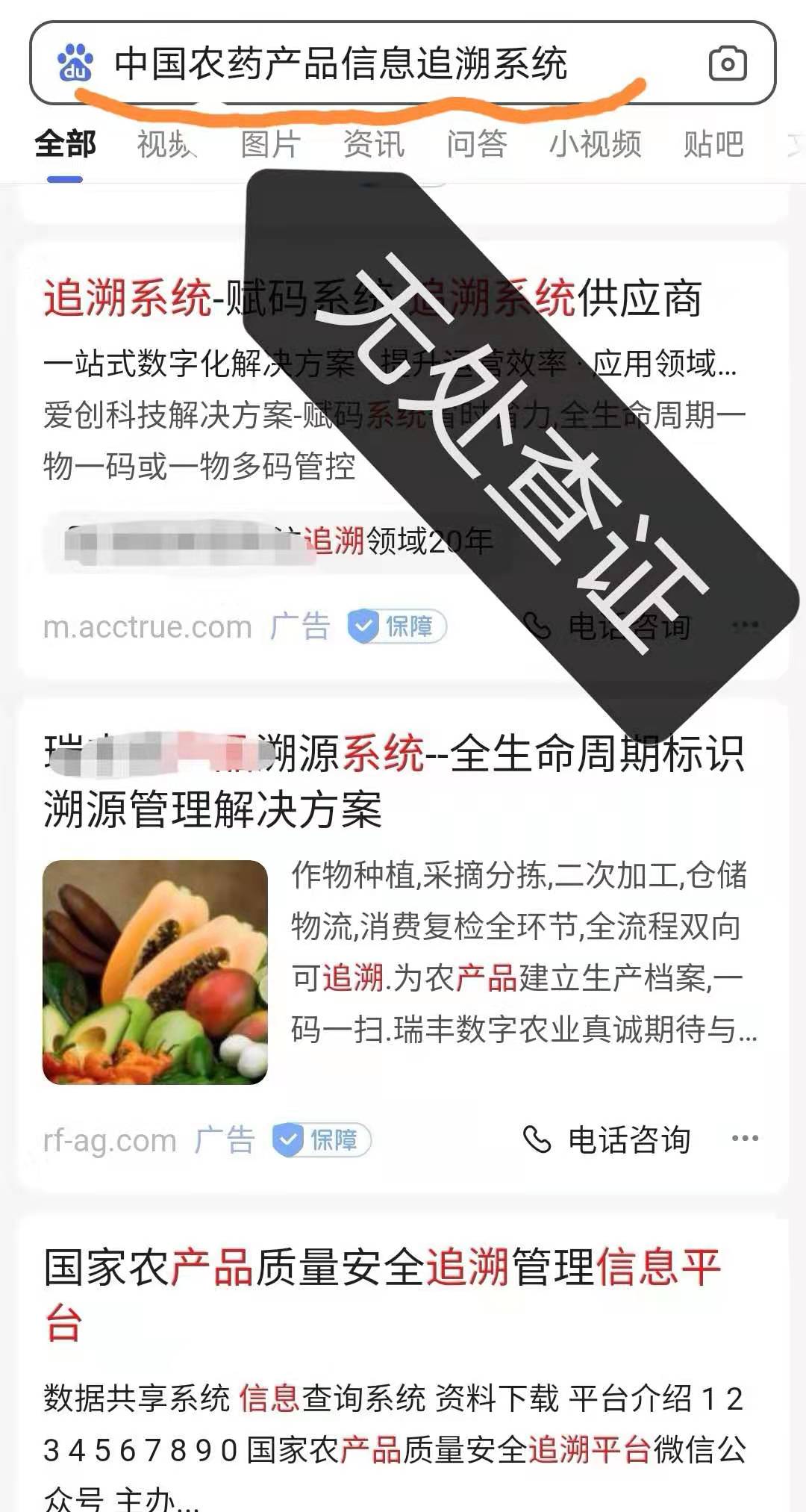 多个假产品进行二维码扫码,均呈现同一个假网页,就连瓶底标注的生产厂家,企业查询没有信息,这样的假冒农资产品,已经流入到农资市场,坑农害农的实例也不胜枚举。
