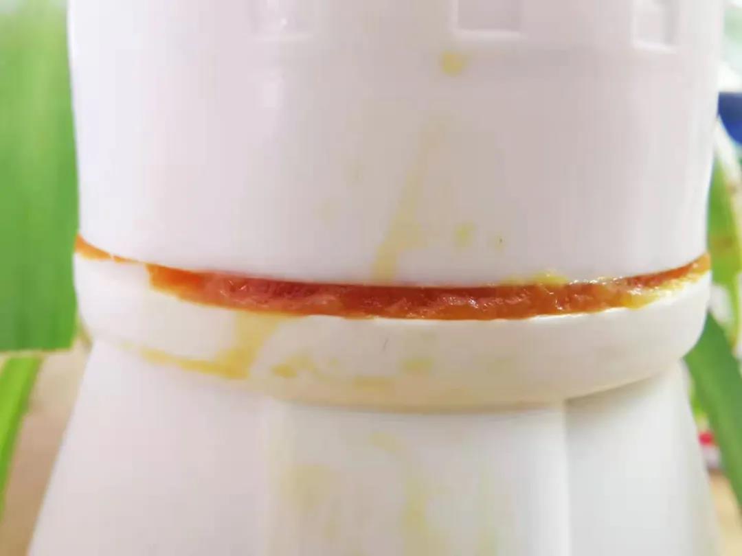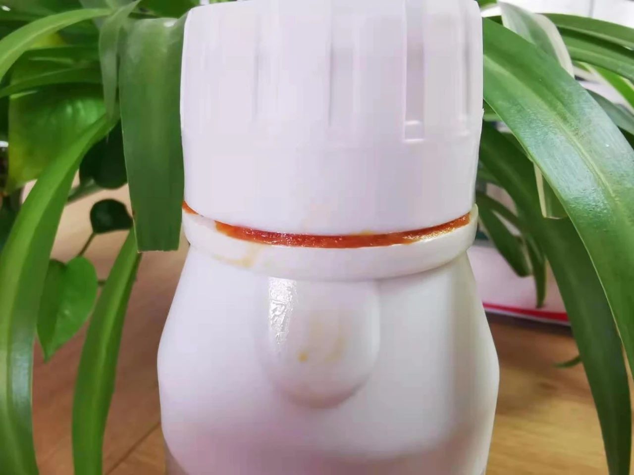 瓶盖还没打开,药液渗透出来,这款名叫“凯螨”成分标明“乙唑螨腈”的杀螨剂,假的实在离谱。粘稠的黄色凝固体,夹杂在瓶盖和瓶身中间。