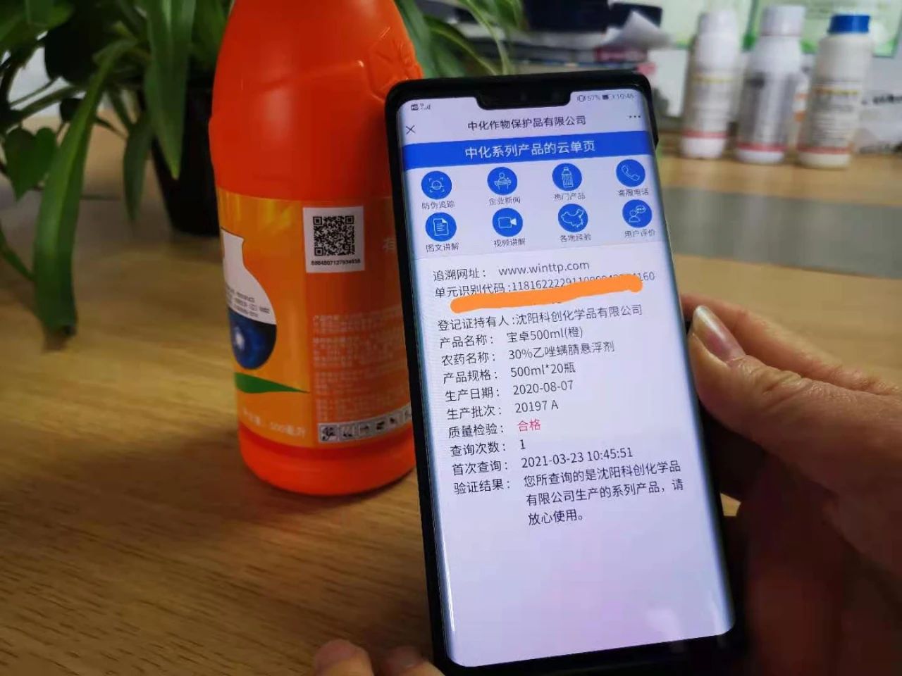 二维码识别中化作物的杀螨剂“宝卓”,登记证持有人是沈阳科创化学品有限公司,该产品由沈阳科创化学品有限公司生产,如有疑问,可拨打电话400-660-8111。