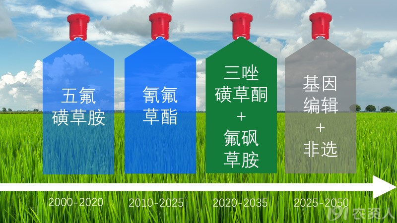 目前水稻抗性杂草的发生呈上升趋势,常用除草药剂五氟磺草胺、氰氟草酯、二氯喹啉酸抗性明显上升,田间防效逐年下降。湖南省农业科学院植保所刘都才教授针对稻田除草提出重要合理的指导意见,着重提出水稻田杂草治理对策“一防二早三多”。具体指:一防:科学预防、延缓杂草抗药性的发生;二早:早检测、早治理;三多:改变单一依赖除草剂的局面,多靶标除草剂应用,多种除草方法结合,多元种植栽培方式。