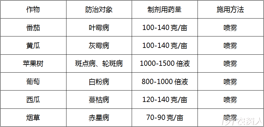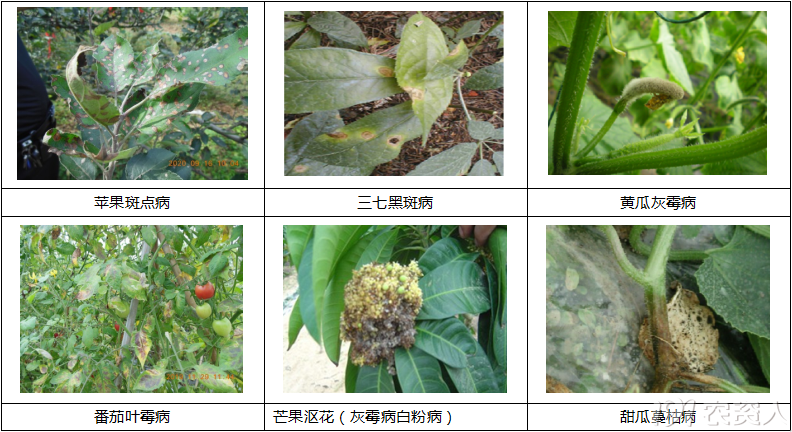 1)链格孢菌引起的病害:如苹果轮斑病、苹果斑点病、梨轮斑病、梨黑斑病、青枣黑斑病、龙眼黑斑病、柑橘褐斑病、烟草赤星病、大蒜葱类紫斑病、豆类黑斑病、十字花科蔬菜黑斑病、番茄早疫病、番茄茎枯病、瓜类黑斑病、西瓜叶枯病;为花穗期的,苹果霉心病、葡萄穗轴褐枯病。
