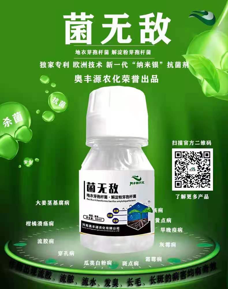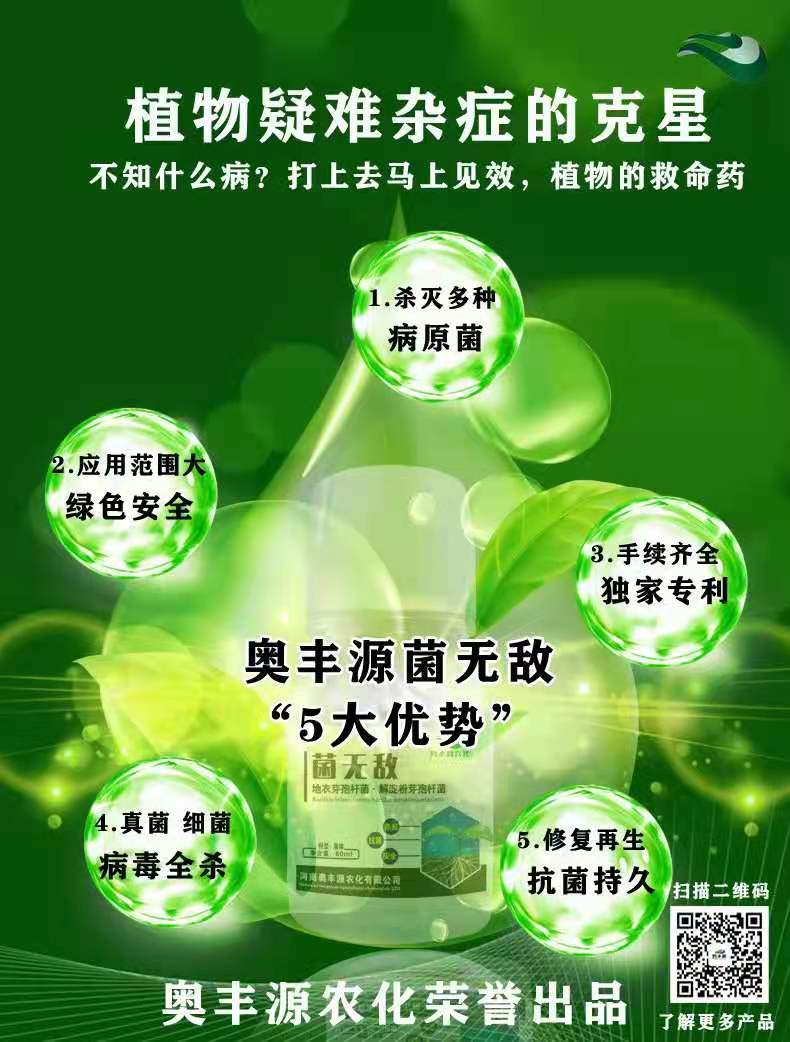 奥丰源农化 菌无敌具备超强的抗菌杀菌能力,可杀死病毒,细菌,真菌,支原体,衣原体等病原微生物。菌无敌与其氧代谢酶结合,让酶失去活性,使病原菌窒息而死,同时也可促进花器官的发育。