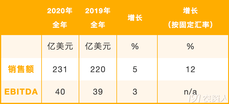 2020年全年,集团销售额231亿美元,较2019年同一备考口径数据增长5%;如剔除15亿美元汇兑损失的影响(按固定汇率),则全年同比增长12%。2020年全年的EBITDA为40亿美元,同比增长3%。