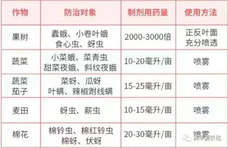 主要防治鳞翅目、双翅目、鞘翅目、缨翅目、半翅目、直翅目的麦蚜、大豆蚜、棉蚜、瓜蚜、菜蚜、烟蚜、烟青虫、菜青虫、小菜蛾、黏虫、草地螟、大豆食心虫、棉铃虫、棉红铃虫、桃小食心虫、苹果卷叶蛾、柑橘潜叶蛾、茶尺蠖、茶小绿叶蝉、小稻潜叶蝇等30余种主要害虫,对害螨也有较好的防效,但使用剂量要增加1~2倍。
