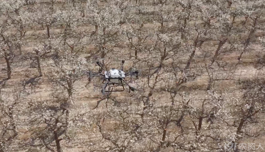 以往传统除蜜蜂授粉外还有人工辅助点粉,存在着粉源、花期短、人工效率低等问题。如今利用无人机液体授粉由于效率高、坐果多、产量好,已经成为越来越多农户的选择。本次我们用大疆 T30 对梨树进行授粉: