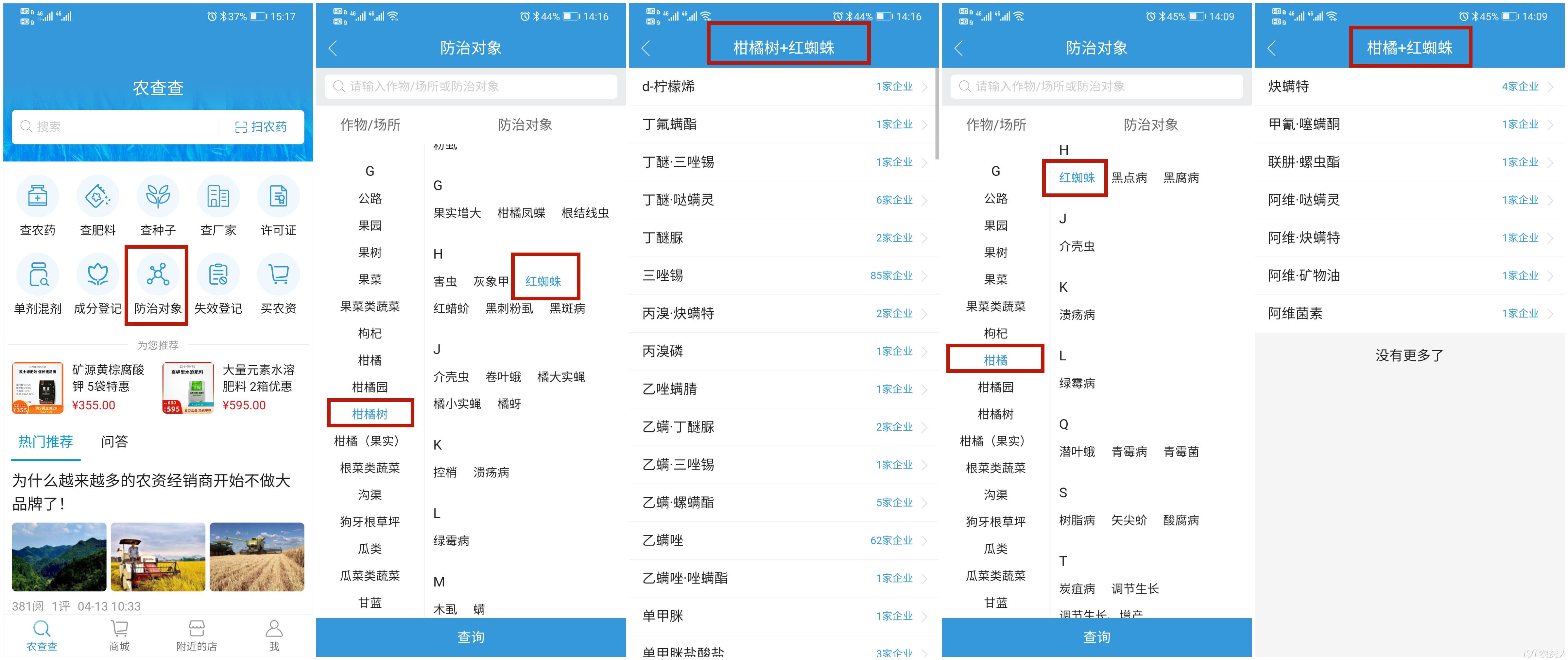 点击首页“防治对象”,在左侧列表选择“柑橘”“柑橘田”或“柑橘树”,在右侧匹配的对象中选择“红蜘蛛”,点击查询即可出现结果。